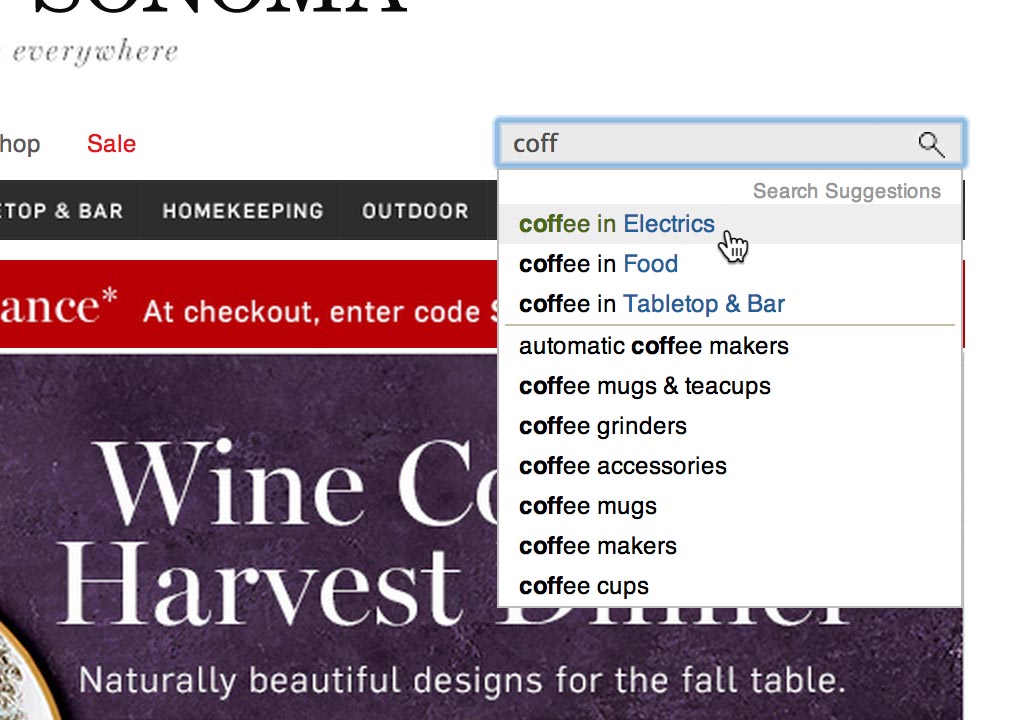 Suggesting a search scope in autocomplete suggestions is ideal timing, as this is where users are deciding on what to search for. Basically asking “You’ve typed ‘coff’, do you want to search for ‘coffee’ within ‘Electrics’ or within ‘Food’?” Notice how the search scope here at Williams Sonoma are styled in blue, making it instantly obvious to the user that “coffee in Electrics” isn’t a simple query but rather a query for “coffee” within the “Electrics” scope.