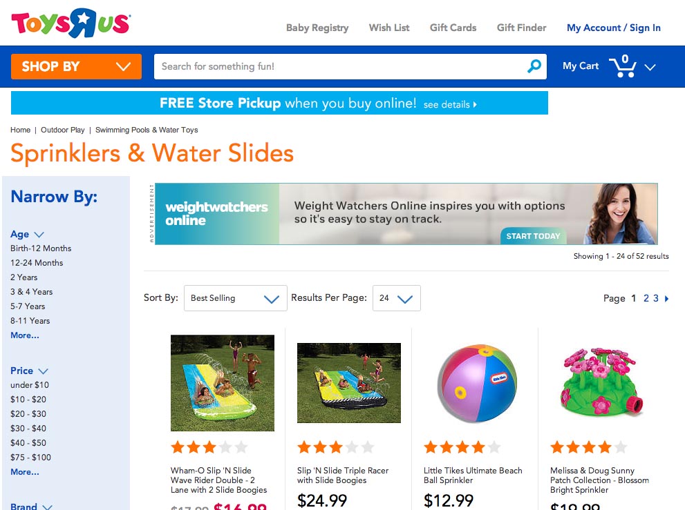 At Toys’R’Us, Product Type queries that match a category will auto-direct the user straight to that page. For example, searching for “water slide” will take the user to the “Sprinklers & Water Slides” category page.