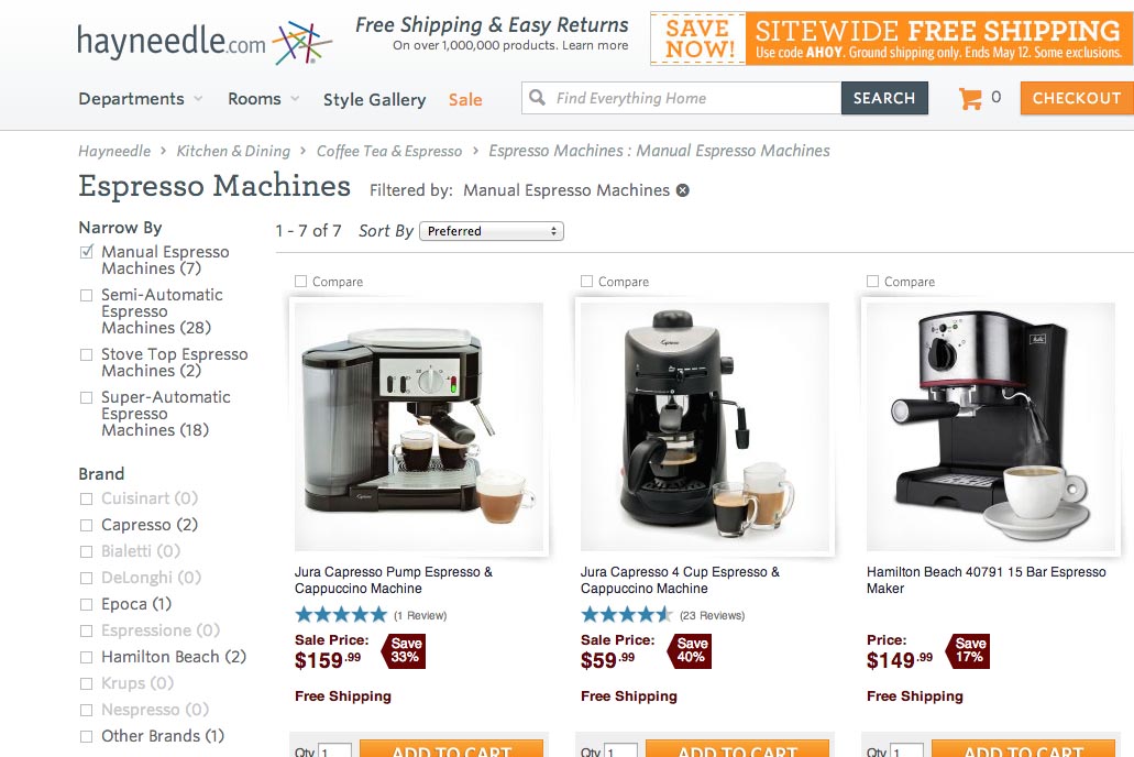Hayneedle’s search logic auto-directs users searching for “manual espresso machines” to the “espresso machines” category/scope with the “manual espresso machines” filter enabled. This approach is more transparent and allows the user to easily revert the site auto-direction by de-selecting the filter.