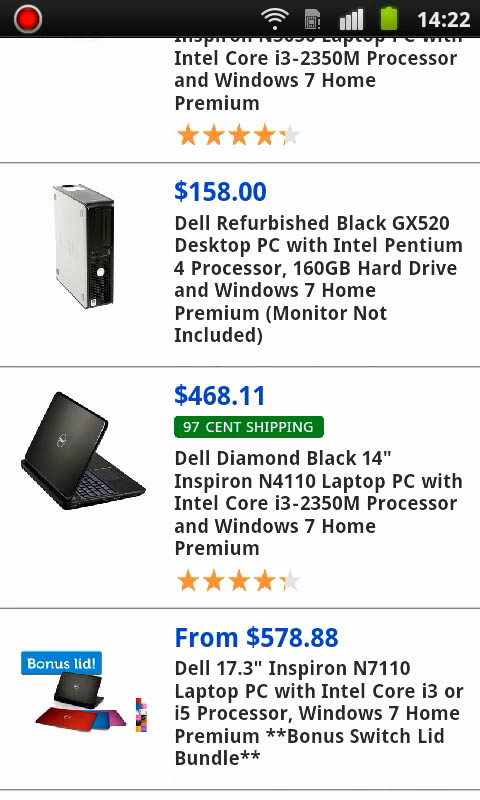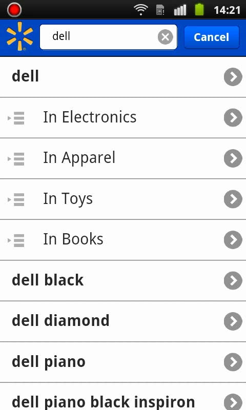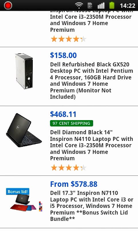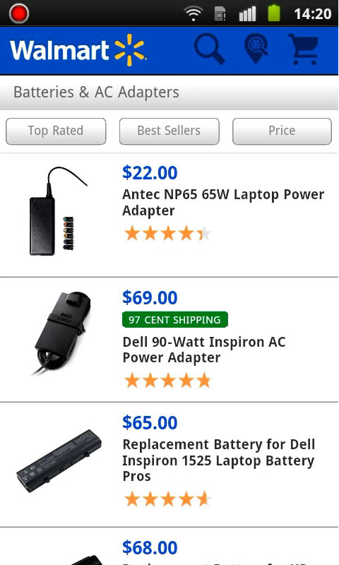At Walmart, one of the test subject were looking for a spare adapter to her Dell laptop and navigated to the highly relevant category ‘AC Adapters’ (first image). Since she only wanted to see adapters for Dell laptops, she proceeded to the search field and typed “Dell” (middle image). Unfortunately, she got a set of site-wide search results, showing mainly Dell computers (last image).