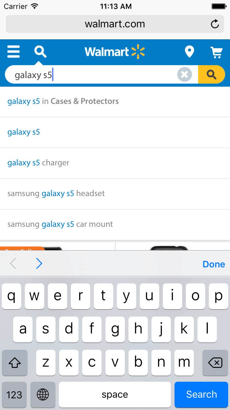 1) Autocomplete: Here the user is suggested to perform their ‘galaxy s5’ query in the currently navigated ‘Cases & Protectors’ category, enabling the user to easily “search within” yet without sacrificing the option of performing the ‘galaxy s5’ query site-wide, in case the user had decided to look for the actual phone or other types of accessories. (Note: this is a mock-up of what the autocomplete solution could look like at Walmart.)