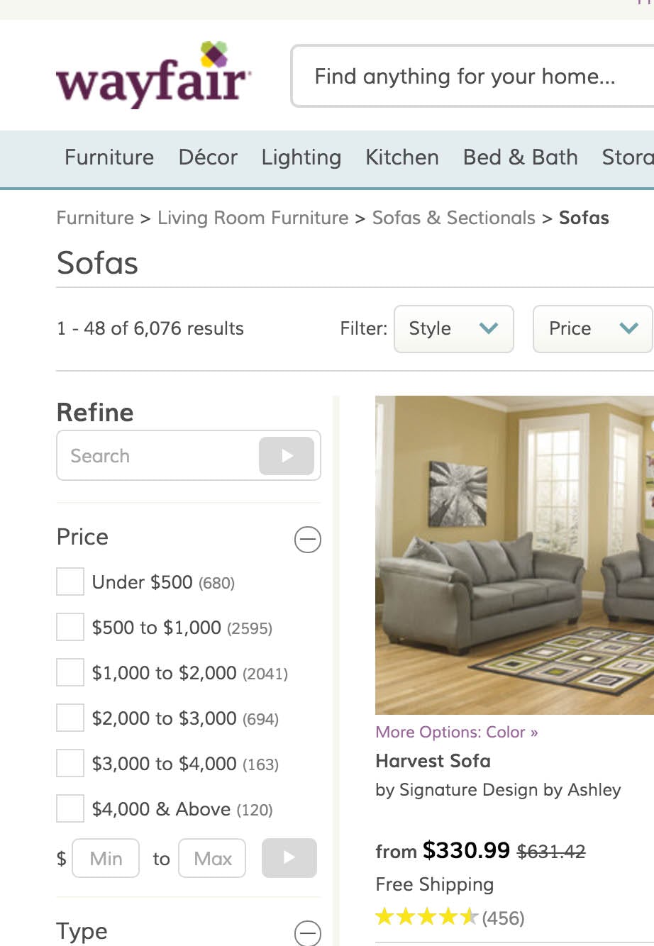Some companies like Wayfair actually have a ‘search within’ feature on their desktop site, but then remove it from their mobile site. A severe case of false simplicity, since mobile is the very platform where it’s needed the most.