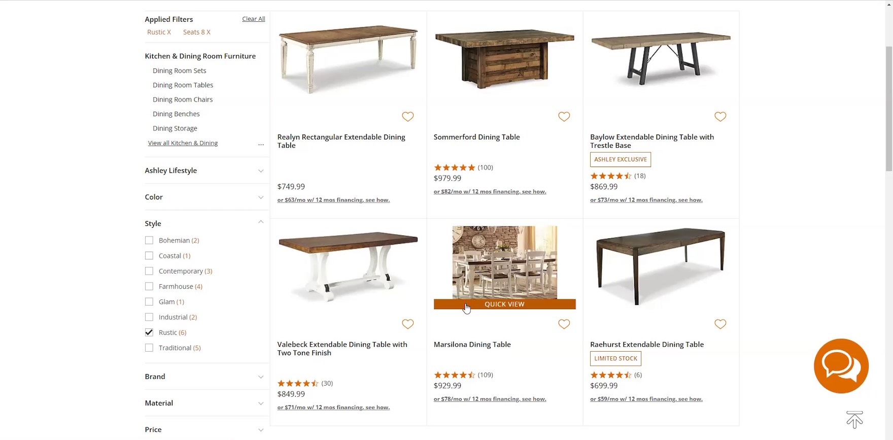 “I like the middle one in the bottom row, but I probably would click on it to see if that’s a slab or if that’s a leaf.” This participant at Ashley Furniture couldn’t tell from the default thumbnail (first image) nor the “Lifestyle” thumbnail on hover (second image) whether the tabletop was one solid piece or extendable, so she had to click through to the product page to find additional images.