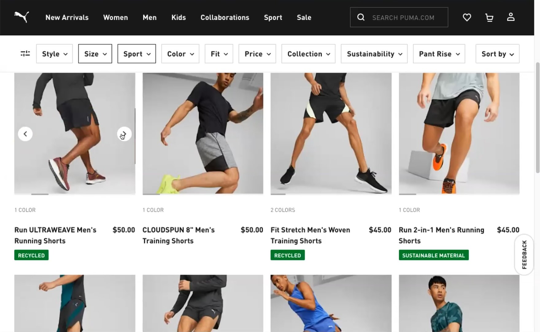 “I like how you don’t have to click into the different items to look at different pictures. They just have a scroll here that’s really useful…Sometimes on the main picture it’s hard to tell…it’s really nice that they have different viewpoints and zoomed in as well,” enthused a participant at Puma perusing running shorts. After noticing carousel arrows appear when he hovered over the thumbnails, he immediately began clicking them for other items, using the extra views to help him better evaluate the shorts (first through third images).