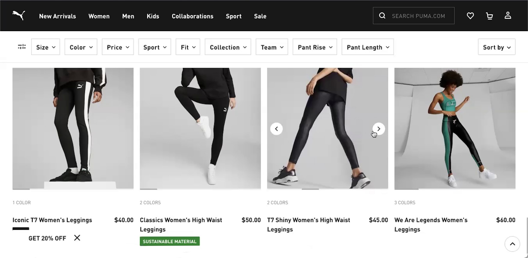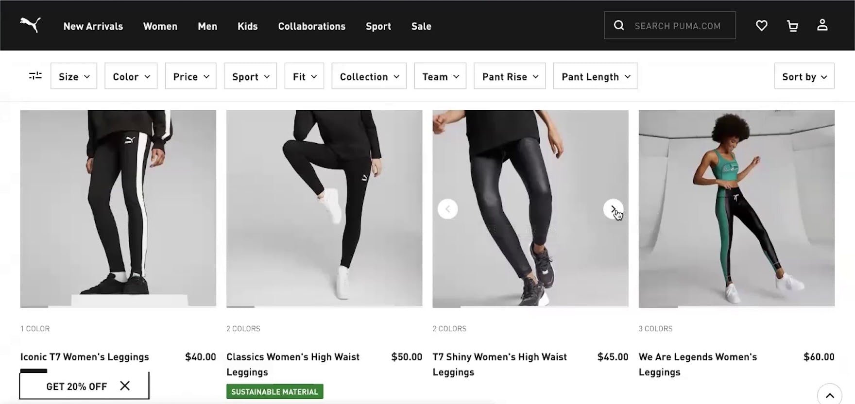 “Oh, I like the shiny ones! I’m going to click through and look.” A pair of leggings at Puma caught this participant’s eye (first image). Using the carousel arrows that appeared on hover she viewed 5 secondary thumbnails for the leggings, including one image that showed the logo detail (“They have a little Puma logo, that doesn’t bother me too much”; second image) and another with a close-up of the fabric (“It kind of looks almost sheer in the back, but I think that’s just the shine”; third image). She then viewed other leggings in the product listings, eventually returning to this pair and quickly adding them to her cart: “I think I’ll go back to the shiny ones. I think those were my favorite so far…I’ll add those to the cart.”