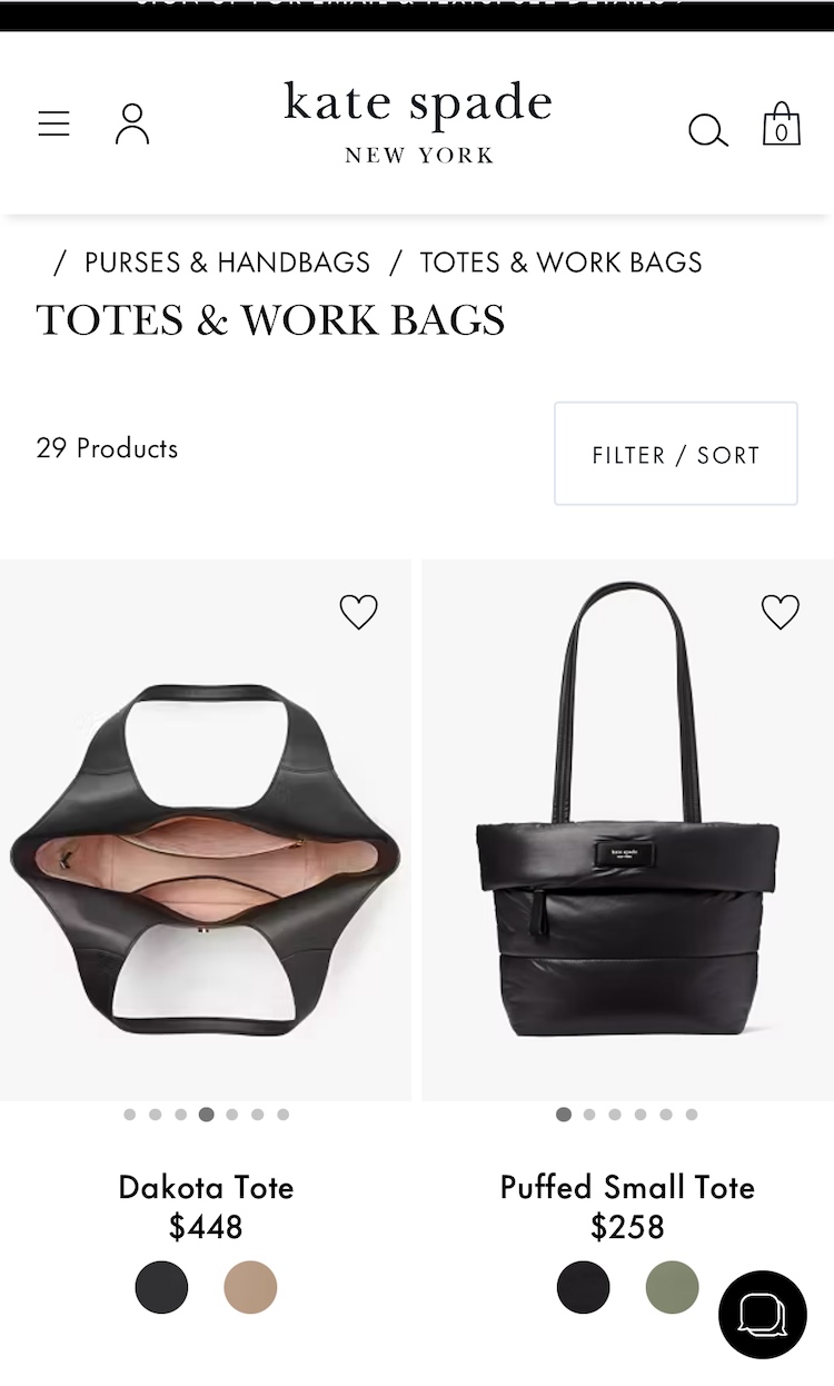 At Kate Spade, users could swipe the default thumbnail to view 5 additional views of totes in the product listings.