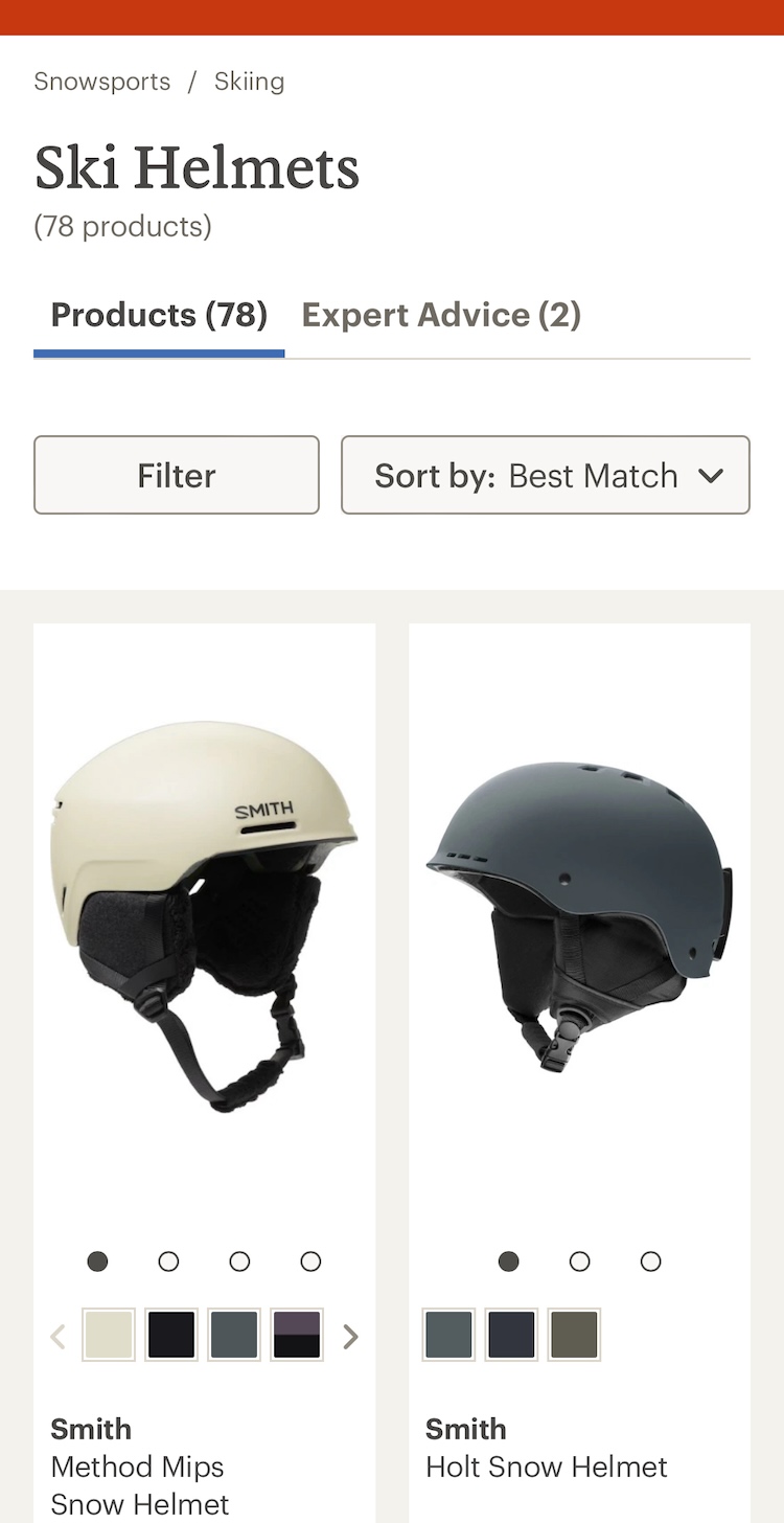 Similarly, users at REI could access more thumbnails of ski helmets by swiping the thumbnail image or tapping on the very large and visible carousel dots.
