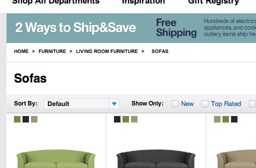 Crate & Barrel doesn’t show sibling categories so the user will need to navigate up the hierarchy just to learn what other sub-categories are available within the thematic “Living Room Furniture” scope.
