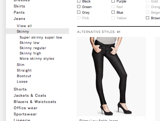 H&M displays sibling categories with their tree-like navigation design. This enables the user to see the different fits of “Jeans” that are available on the site, so if the user isn’t happy with the products in the selected “Skinny” category, they can easily adjust their scope to e.g. “Slim”.