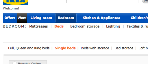 Sibling-categories naturally extend from IKEA’s horizontal navigation bar, making it easy for the user to infer their current location in the site’s hierarchy, and by virtue of that, better understand the scope of the selected “Single beds” sub-sub-category.