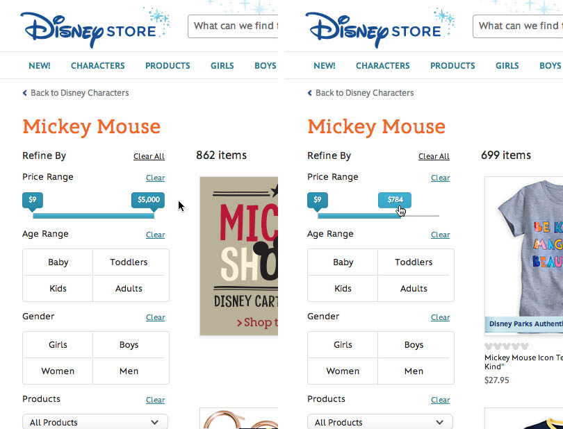 At the Disney Store, the price slider goes from $0 to $5,000. However, notice in the second image how Disney has cleverly used a non-linear slider scale as there are very few products that cost more than $1,000. This way the $1,000 - $5,000 range only takes up 25% of the slider width. Had the slider had a linear scale this upper price range would have consumed 80% of the width, which would have made it almost impossible to set a more common price range such as $25 - $45.