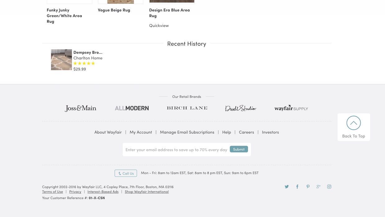 Links to non-product content, such as email subscriptions, return policy details, and general help are often in the footer on e-commerce sites. While a fine design practice in itself, placing the content in such out-of-the-way areas of the interface means in practice that many users will have some degree of trouble finding it.