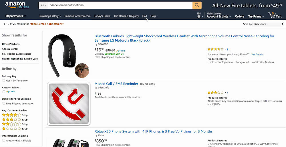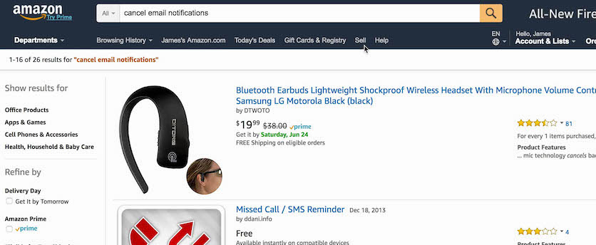 “‘Cancel email notifications’, but they are showing me a whole bunch of stuff. ‘Noise-Cancelling’…that’s not what I want” a user said. Searching for “cancel email notifications” on Amazon (first image) or “unsubscribe” (second image) returns only products, but no links to content related to how to unsubscribe from email newsletters.