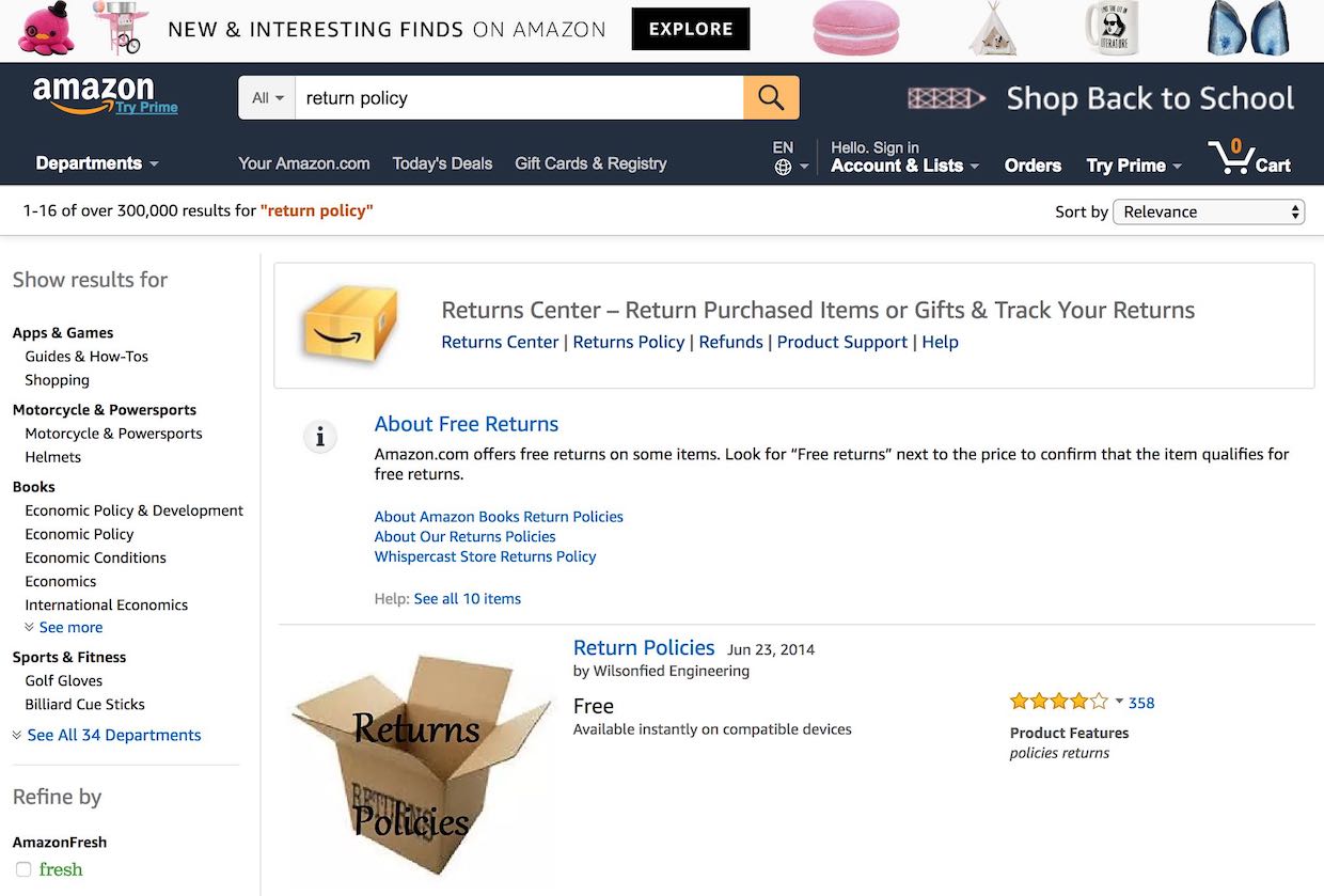 Searching for “return policy” on Amazon yields returns center links, as well as a short description of the return policy along with a set of links to relevant help sections.