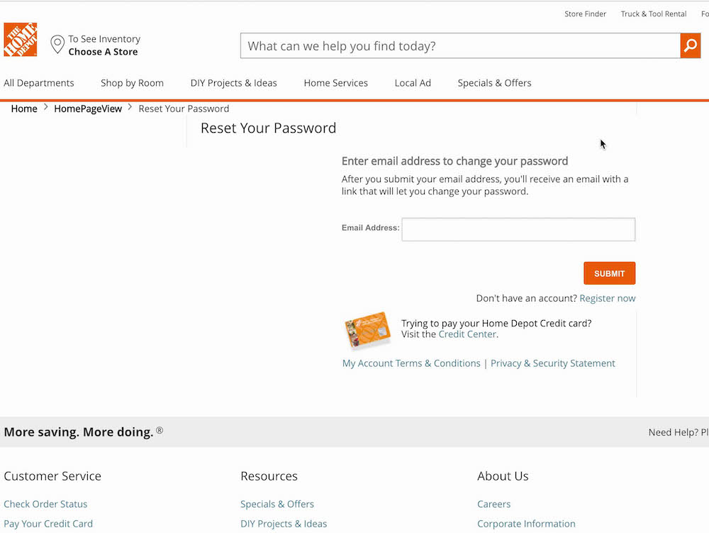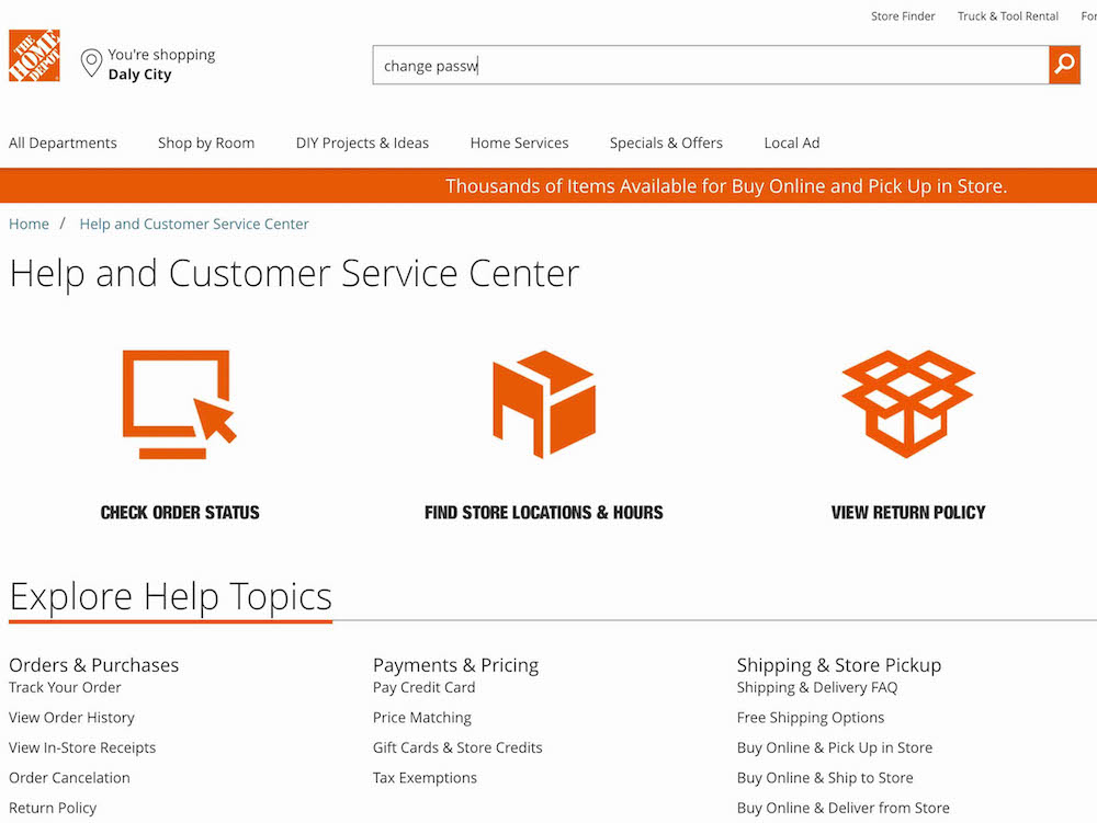 Home Depot brought the user who searched for “change password” (first image) directly to the password-reset page (second image). By bringing users directly to the start point of their account-related tasks, the site is making their experience more efficient.