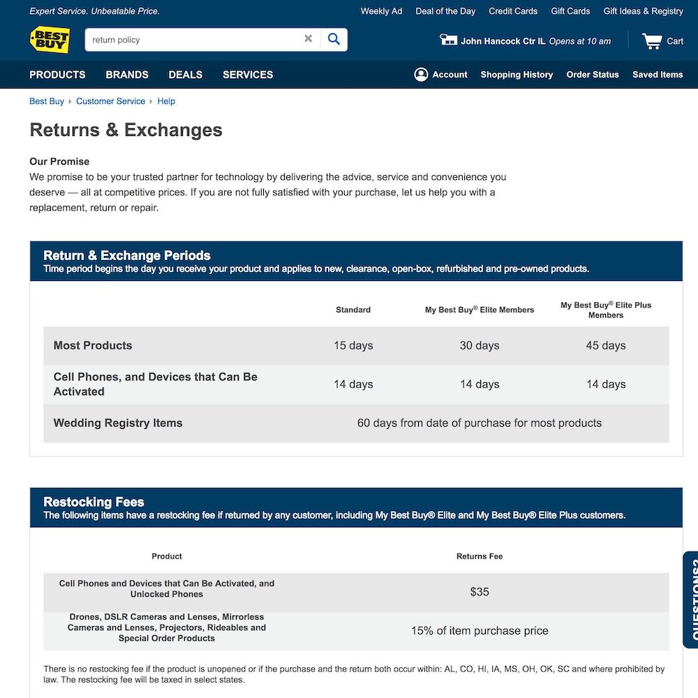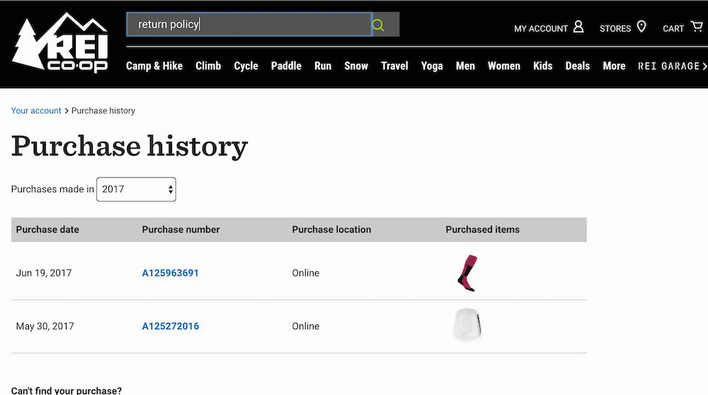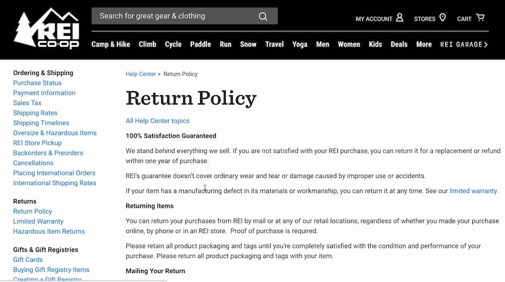 During testing at REI, searching for “return policy” (first image) took users directly to the “Return Policy” page (second image).