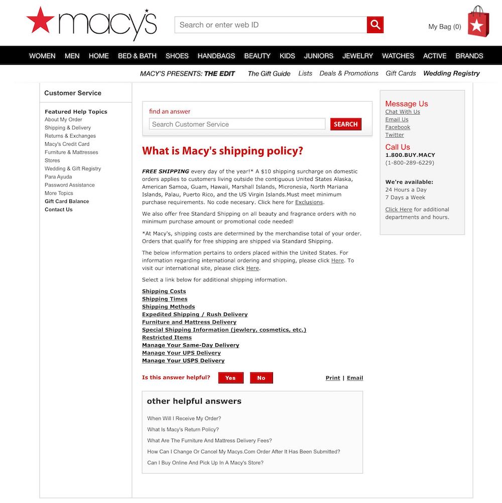 Product categories typically get the primary navigation spot (as they should); however, as a consequence, auxiliary navigation to content such as help sections, return information and tools, shipping information, store locators, and more gets relegated to the page footer or to other secondary places in the main navigation.