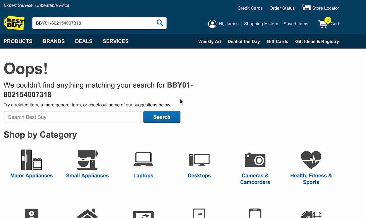 “If I had [the tracking number] I thought I’d be able to search everything on the site itself and be able to locate it”. A user at Best Buy gets no relevant results when entering the order-tracking number for an order. Failing to support a variety of non-product search queries forces users to find the information they’re looking for using other means — which may or may not be successful.