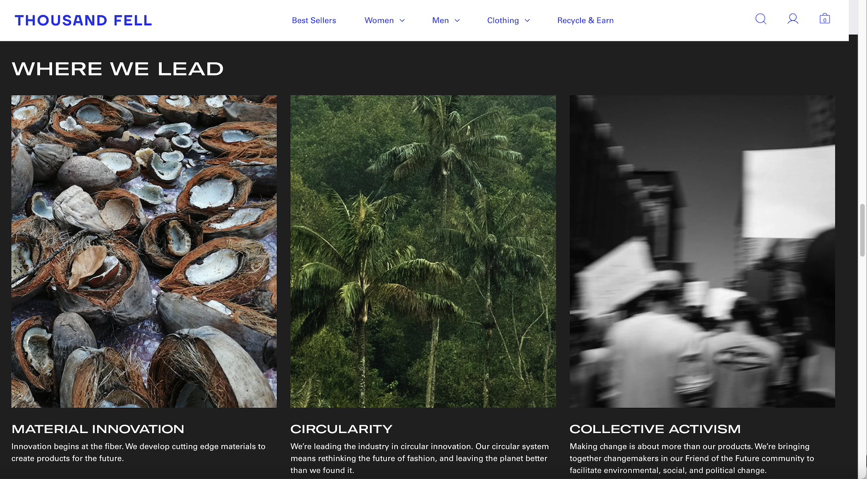 At Thousand Fell, the homepage relays the brand’s sustainability focus through microcopy, images, and linked content — giving users who seek more information very clear scent trails to follow.