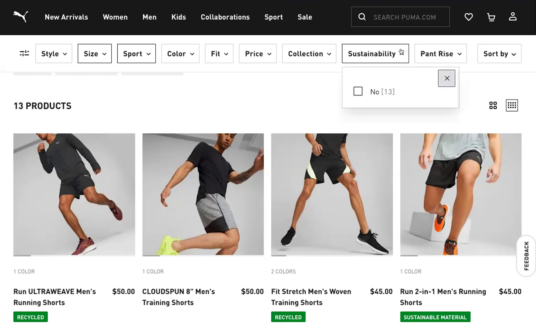 “‘Sustainability’”, I’m not sure again…what’s defined as ‘sustainable’ or not? There’s a lot of filters here. At first glance, I don’t know what a lot of these mean, so they’re not that useful to me.” If they don’t know what a filter type means, users like this participant on Puma could avoid them, potentially overlooking suitable items that could have been isolated by applying this filter.