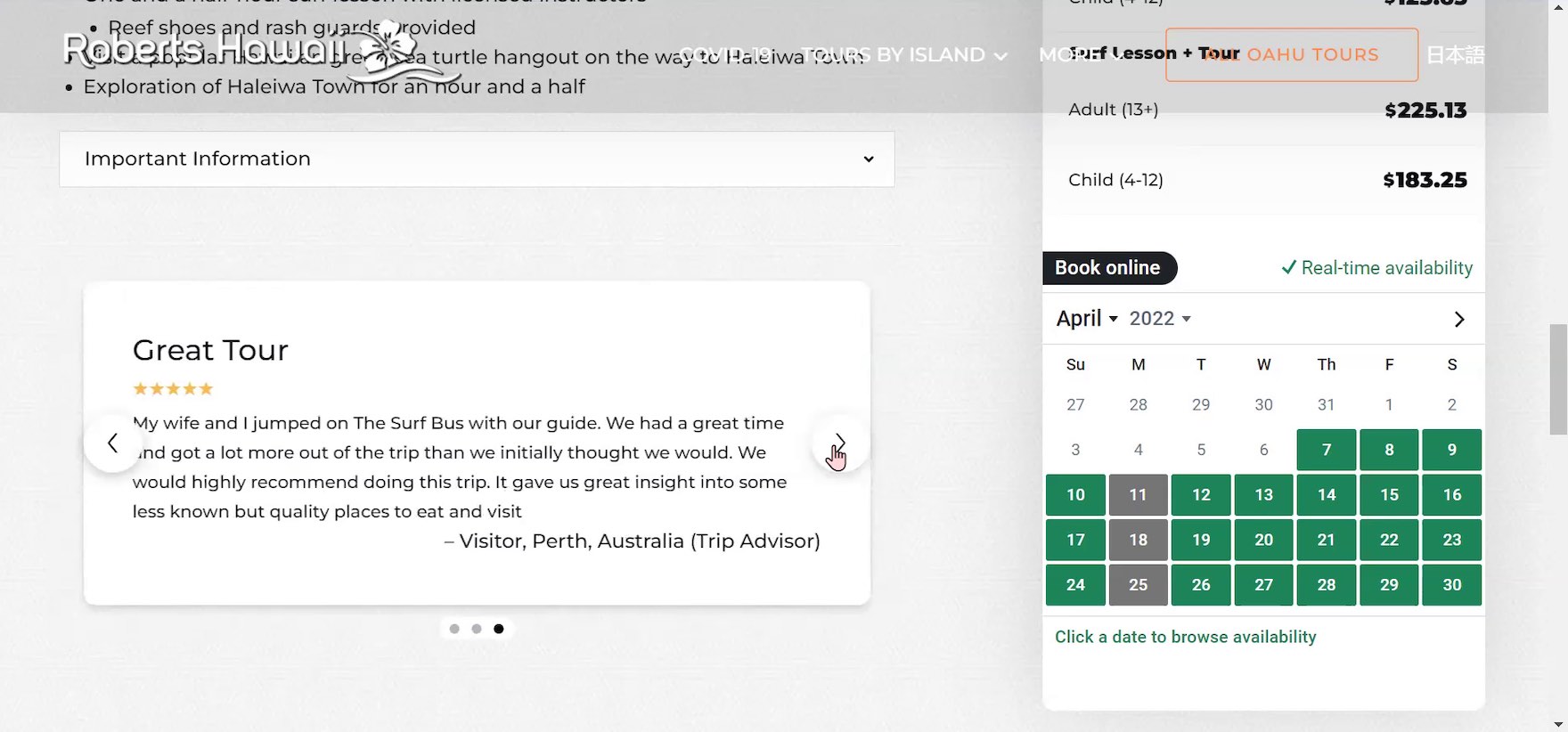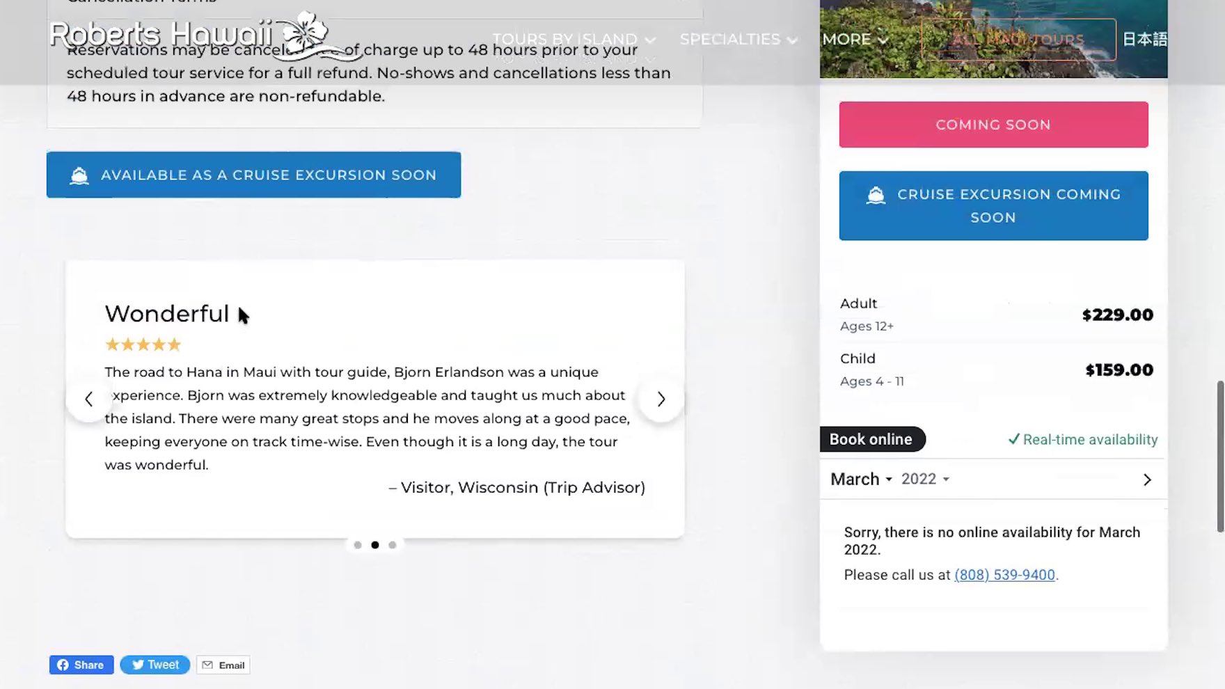 “Okay, so they only have a couple of reviews. That’s kind of a deterrent for me. I’d like to read more reviews to get a more broad spectrum of people’s feedback”, complained a participant at Roberts Hawaii, clicking through the carousel of curated Tripadvisor reviews. Deterred from exploring tours due to a lack of access to the full range of reviews, she eventually abandoned the site.
