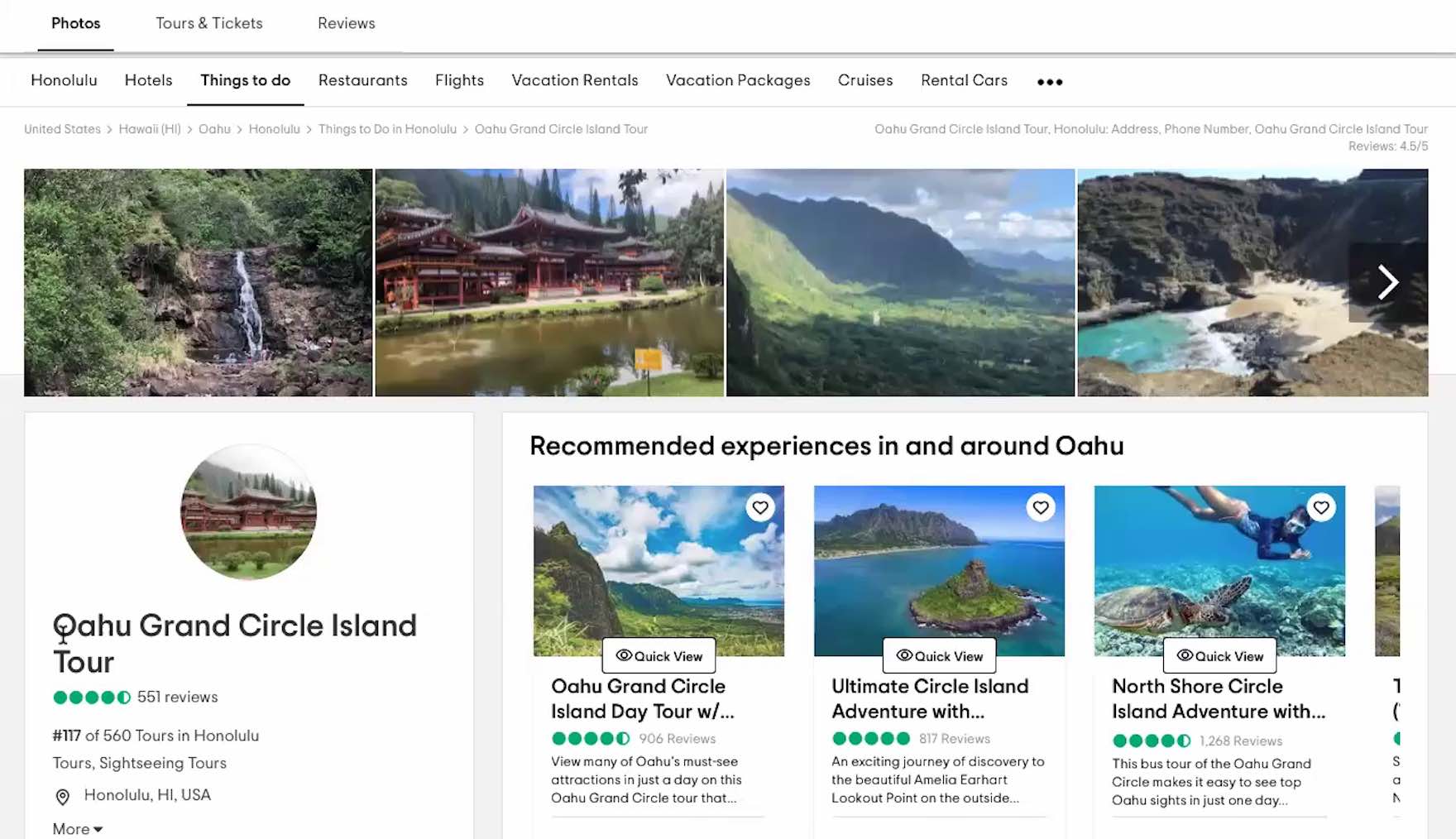 In practice, linking directly from integrated third-party ratings, reviews, awards, and endorsements to the underlying reviews, the associated “Tour Details” page, or the company “Profile” page saves users the time and effort of manually navigating to that third-party site and searching for the desired information.