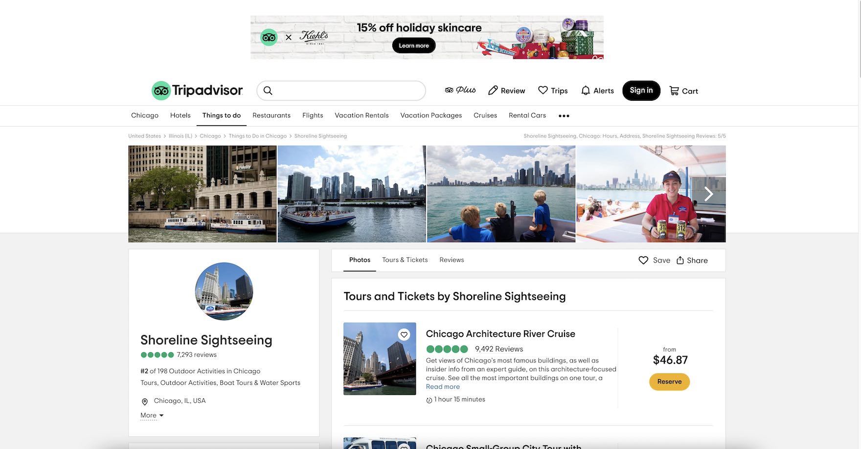 “[It] doesn’t look like they have any kind of reviews on this one. So, that’s where I might have to go to a different website”, remarked a participant at Wendella as he scrolled the “Tour Details” page for a river architecture tour (first image). Third-party reviews from Yelp, Tripadvisor, and Google, along with links to more reviews at those sites, were only featured on the homepage (second image, taken after testing concluded by the researcher). Limiting the display of integrated third-party content like ratings and reviews to only the homepage risks a subgroup of users overlooking it entirely.