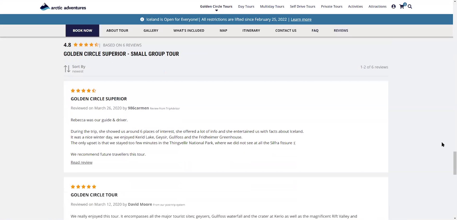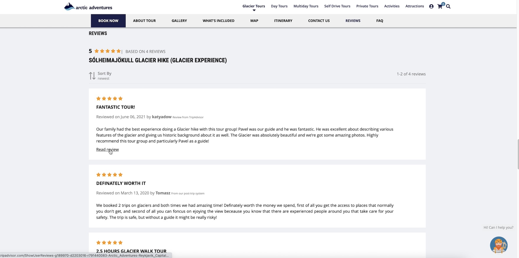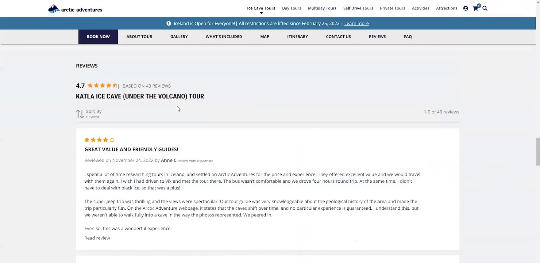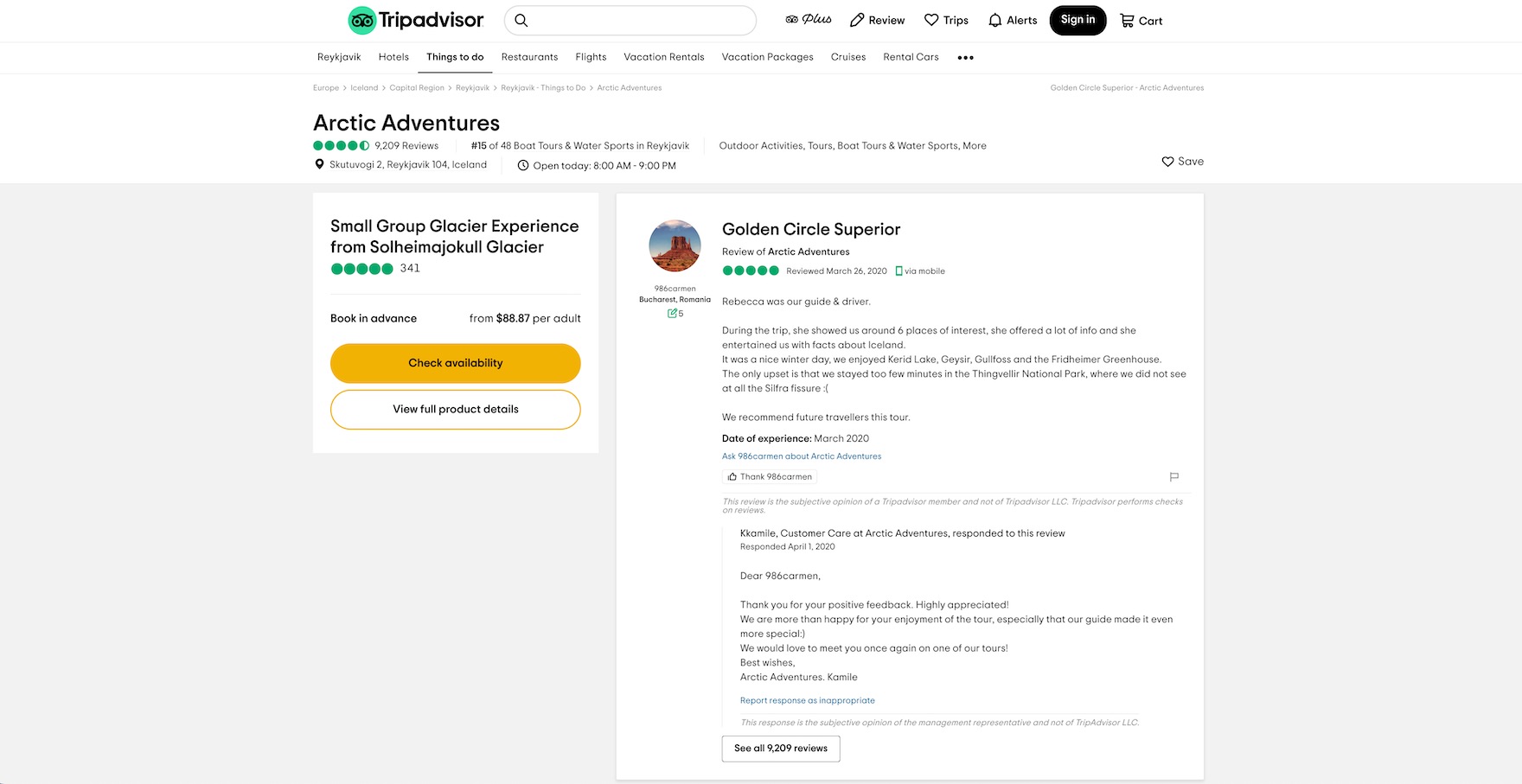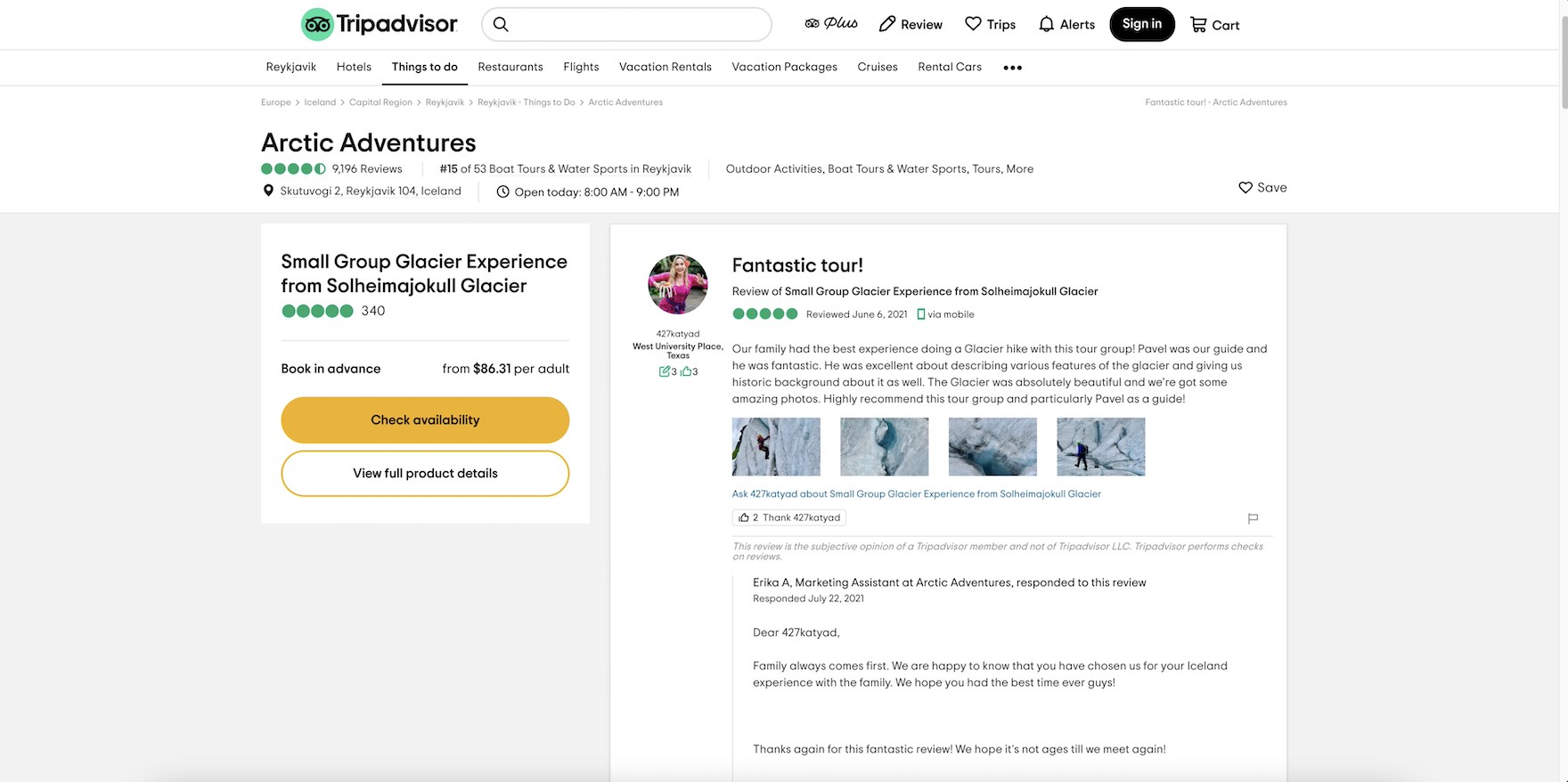 “I would take a look at the reviews and see what people are saying”, remarked a participant at Arctic Adventures. She was positively encouraged by the mix of site-provided and third-party reviews on the “Tour Details” page to book the “Katla Ice Cave Tour”.
