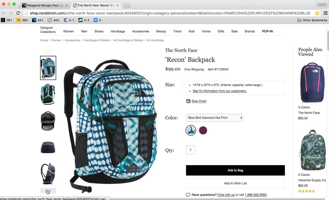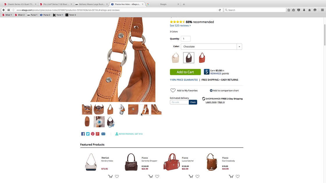 Subjects were easily able to view all of the available product thumbnails on eBags, which were simply displayed in two rows underneath the main product image. This design eliminates the risk that users will mistakenly skip over product thumbnails because they’re unaware of them.