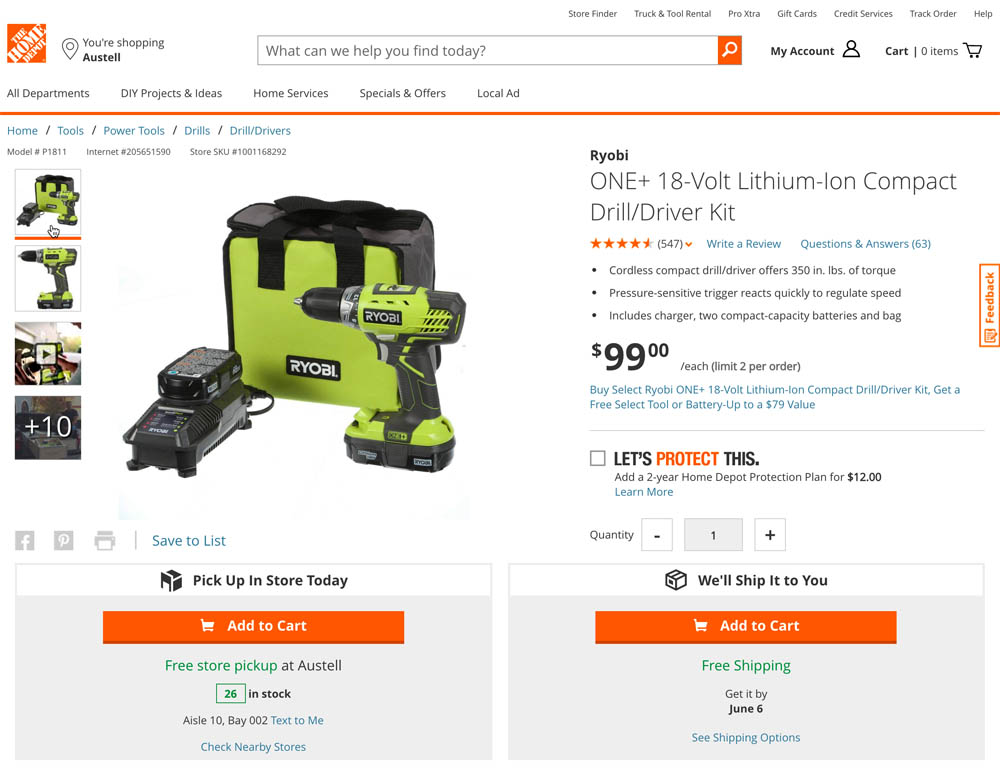 Some product pages provide a “manual carousel” to switch between the truncated product thumbnails. This provides users with manual carousel controls — typically in the form of “arrows” — to indicate the existence of truncated product thumbnails. Such designs performed poorly during testing. In fact, 60% of subjects either never found the truncated product thumbnails or had trouble finding them when the product thumbnails were within a manual carousel located below the main product image (as in the Home Depot example above).