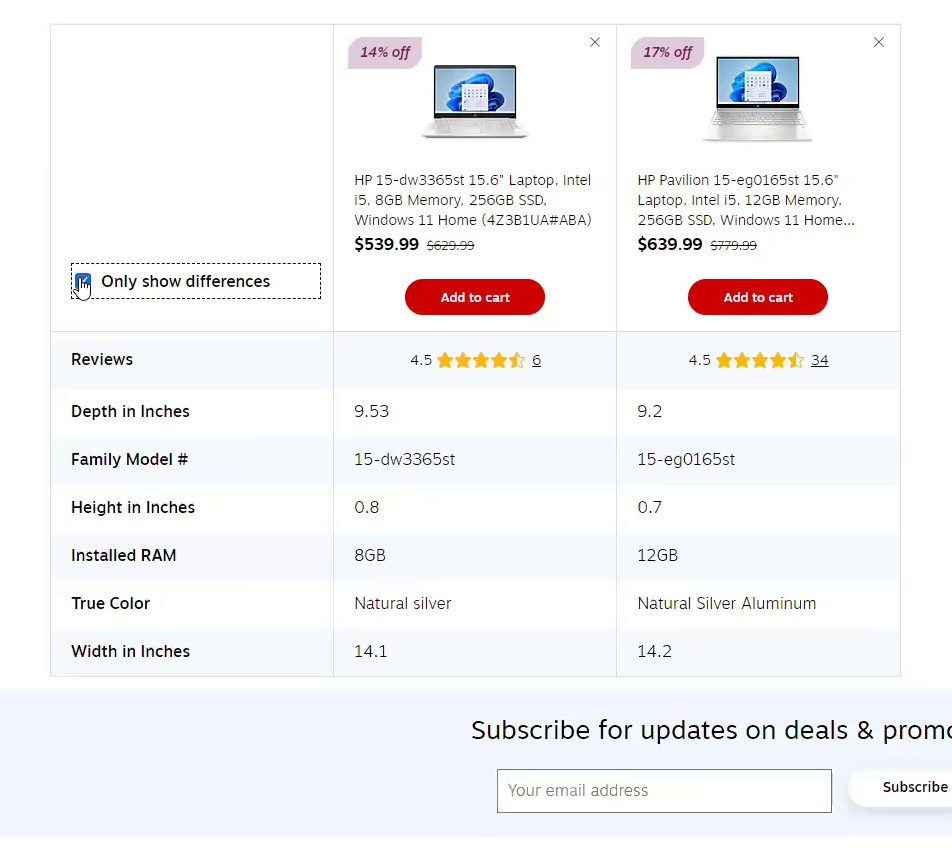 “Oh, you can even do ‘Only show differences’. Some of these differences don’t even matter. The big one is the RAM.” Before this test user noticed the “Only show differences” button on Staples, he spent awhile scrolling through the specs (first image). After he hid the specs that the two products shared (second image), he found the process of comparison much easier.
