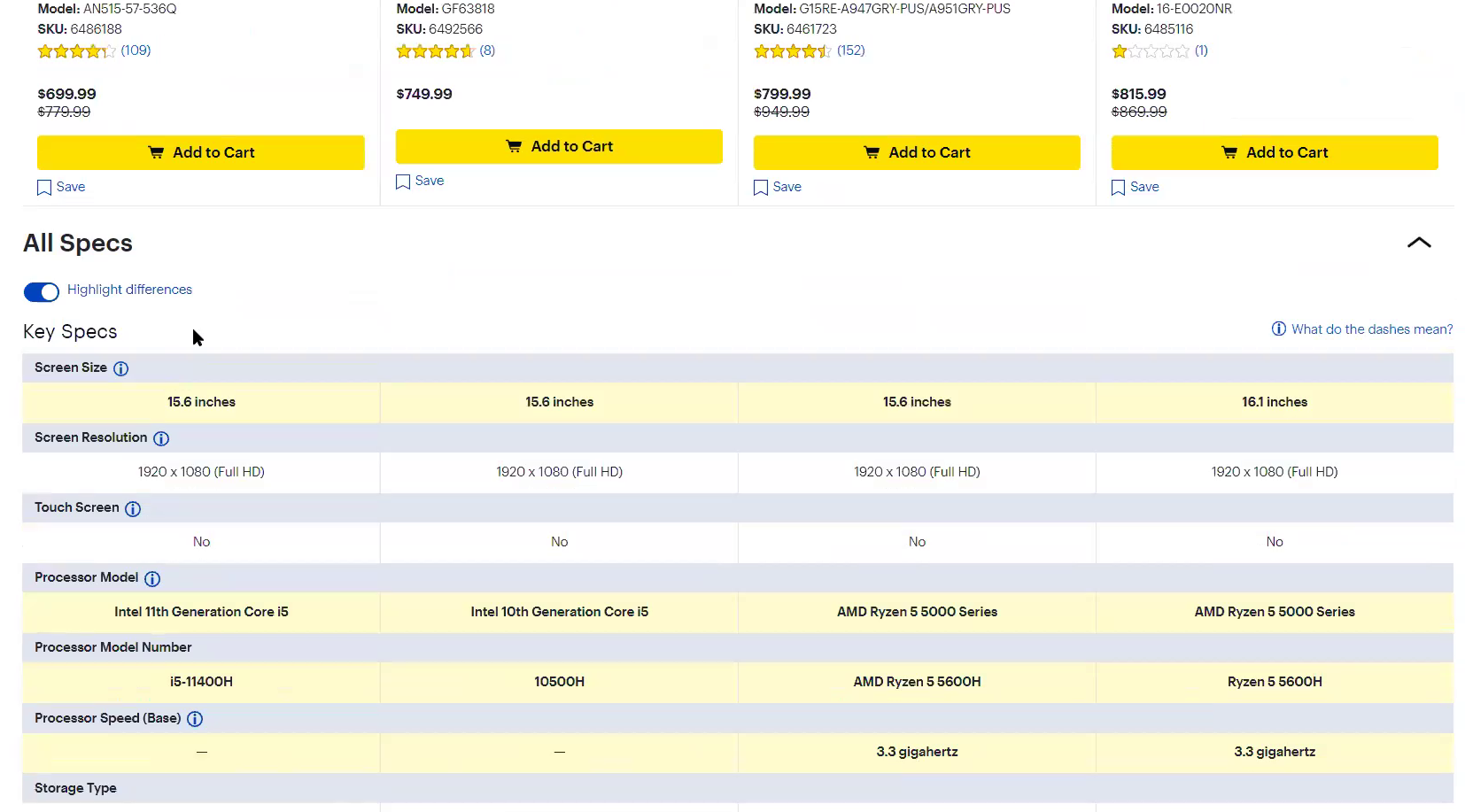 “Yes, and this one has the option to highlight the specific differences, like they all don’t have touch screen, screen resolution, and it doesn’t matter. The things that really matter are highlighted…the real differences.” Highlighting differences, as is done on Best Buy, is also helpful as this test user found, but doesn’t isolate the differences as much as when the common specs are hidden.