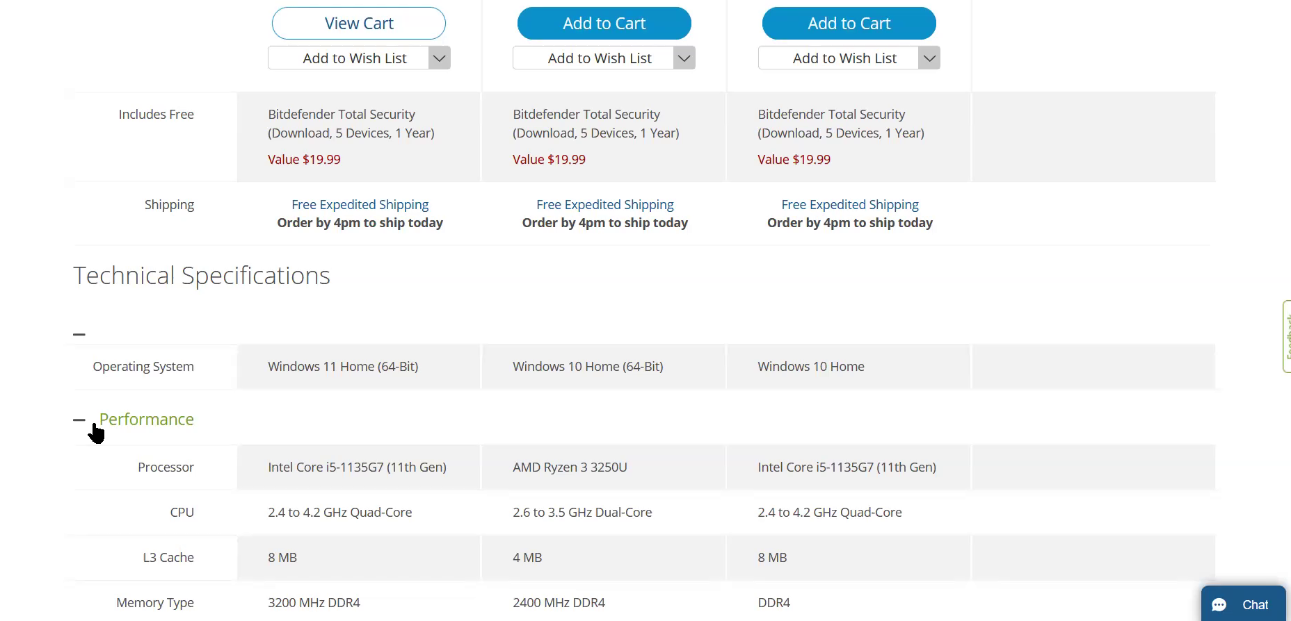 “B&H categorizes each of these features in its own subheading, like ‘Performance’ and ‘Display’. I like that more than the Staples way with an alphabetical order…I’m just better able to organize in my head what features I’m actually looking at right now.” For this test participant and many others, organizing features into categories made it much easier to locate specs of interest than if the attributes were simply listed alphabetically.