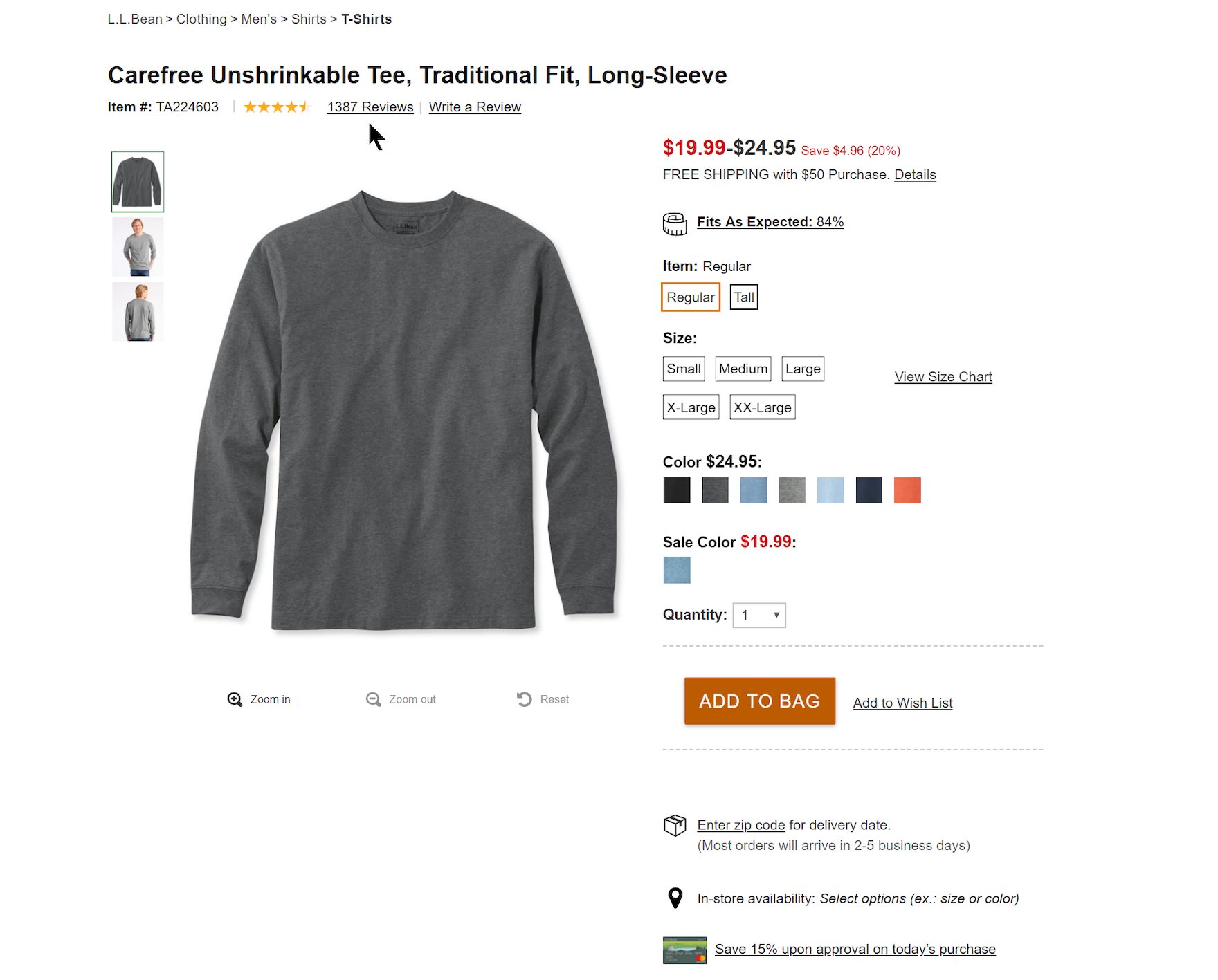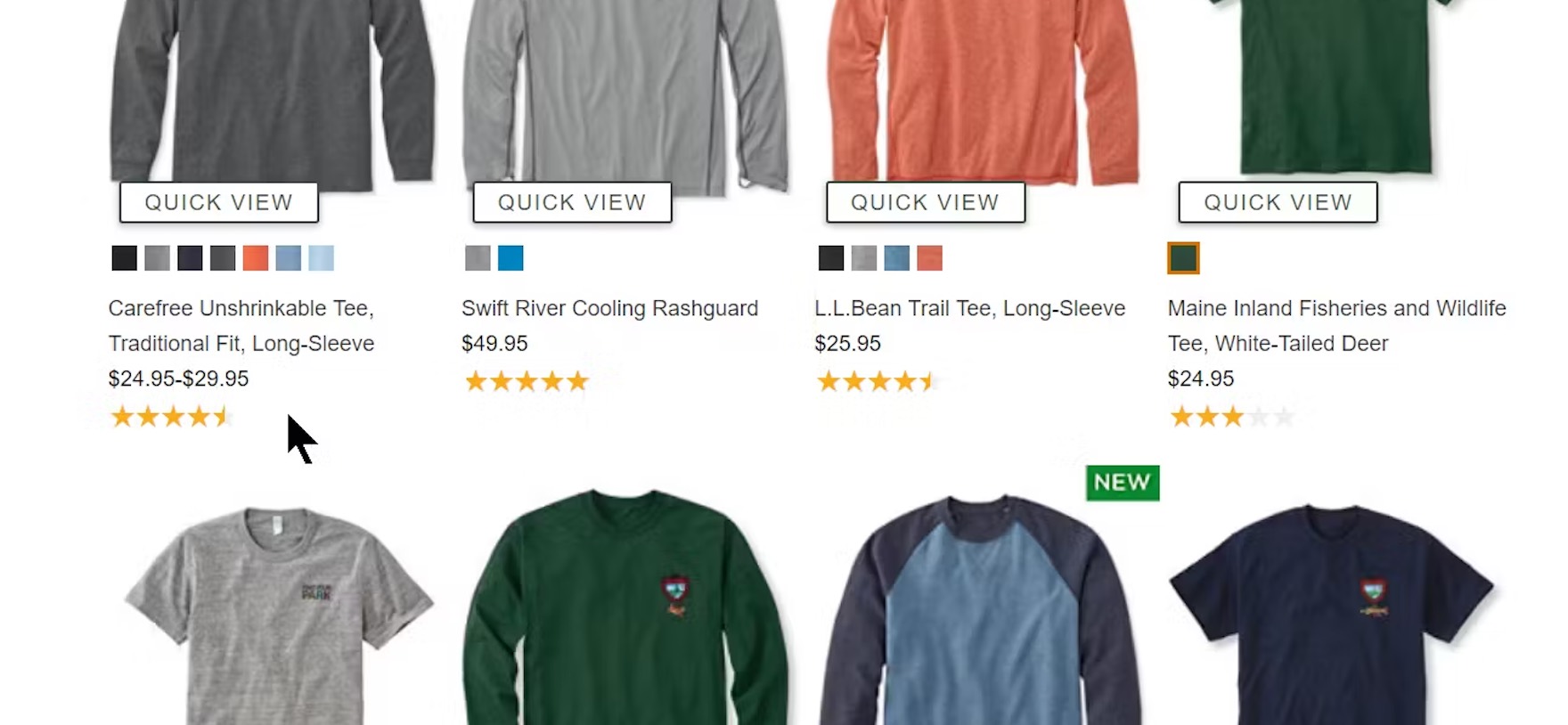 The number of ratings is not shown in L.L. Bean’s list items. The first item in the product list (first image) has a high number of ratings (1,387) as seen on the product details page (second image), but the absence of the count from the product list takes an important decision-making element away from users.