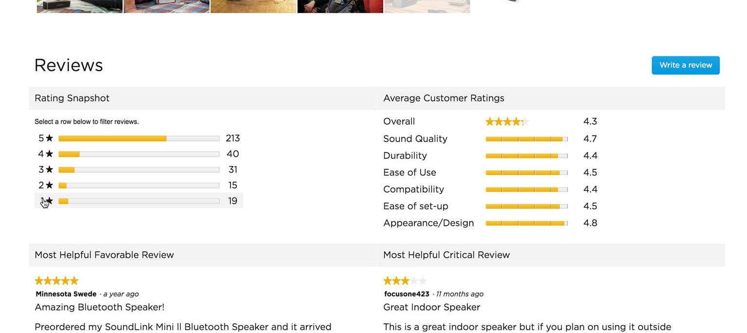 However, without a ratings distribution summary UI at the top of the review section, users are prone to let the first handful or page of reviews determine if they perceive the product as being overall well or poorly rated.