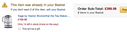 Amazon detects that the product is already in the user’s cart and displays a notice stating that the quantity is now two, but providing a direct link to “edit your Basket” in case the user only wanted one.