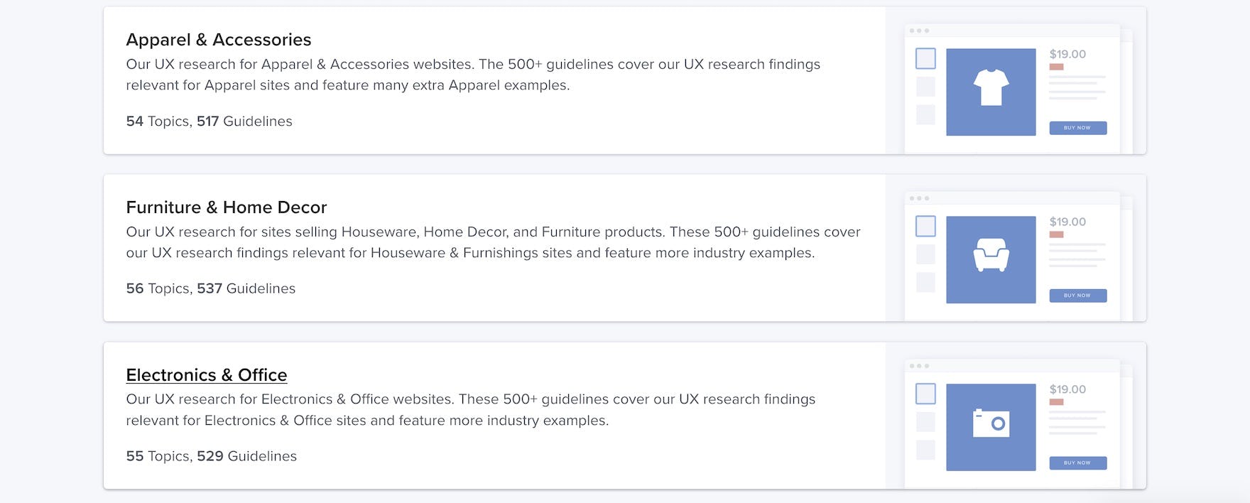 Over 10+ years of e-commerce usability testing and 130,000+ hours of UX research at Baymard, a consistent pattern has emerged: a large part of the issues users experience, and the design solutions required to resolve them, are largely shared and universal across sites and industries.