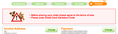 Take a close look. What’s the next action? On most sites, you’d normally expect that you were supposed to review the order details and then click “Place order”. But doing that at ZooPlus.com resulted in this error: