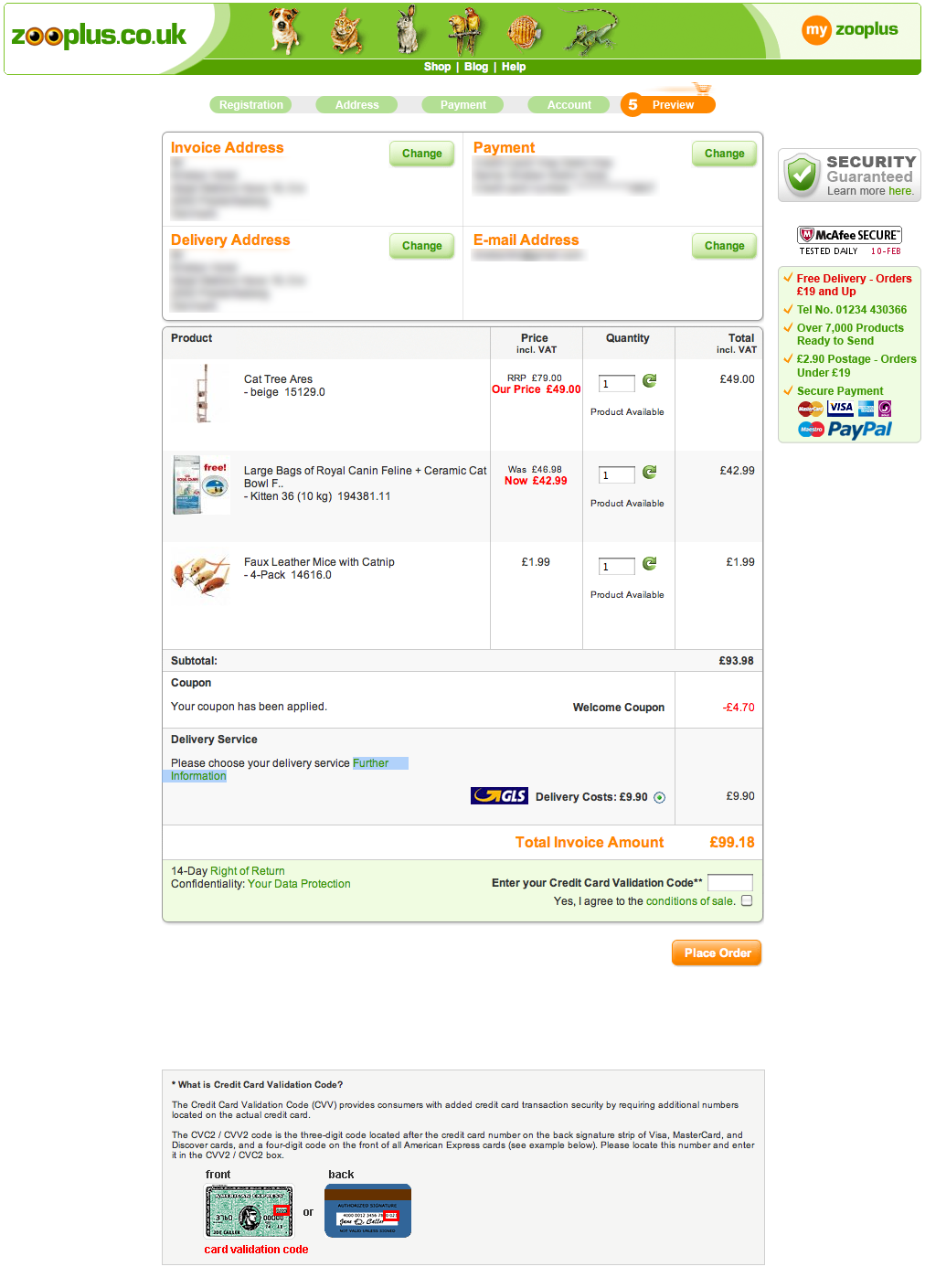 ZooPlus had a pretty decent checkout process usability-wise up to the “Review” page, yet orders are more likely to be abandoned due to this one poorly designed element.