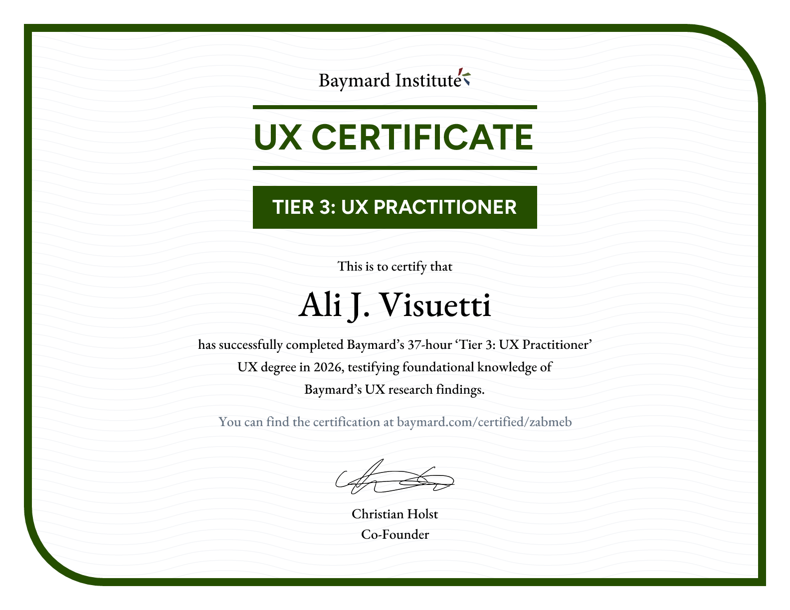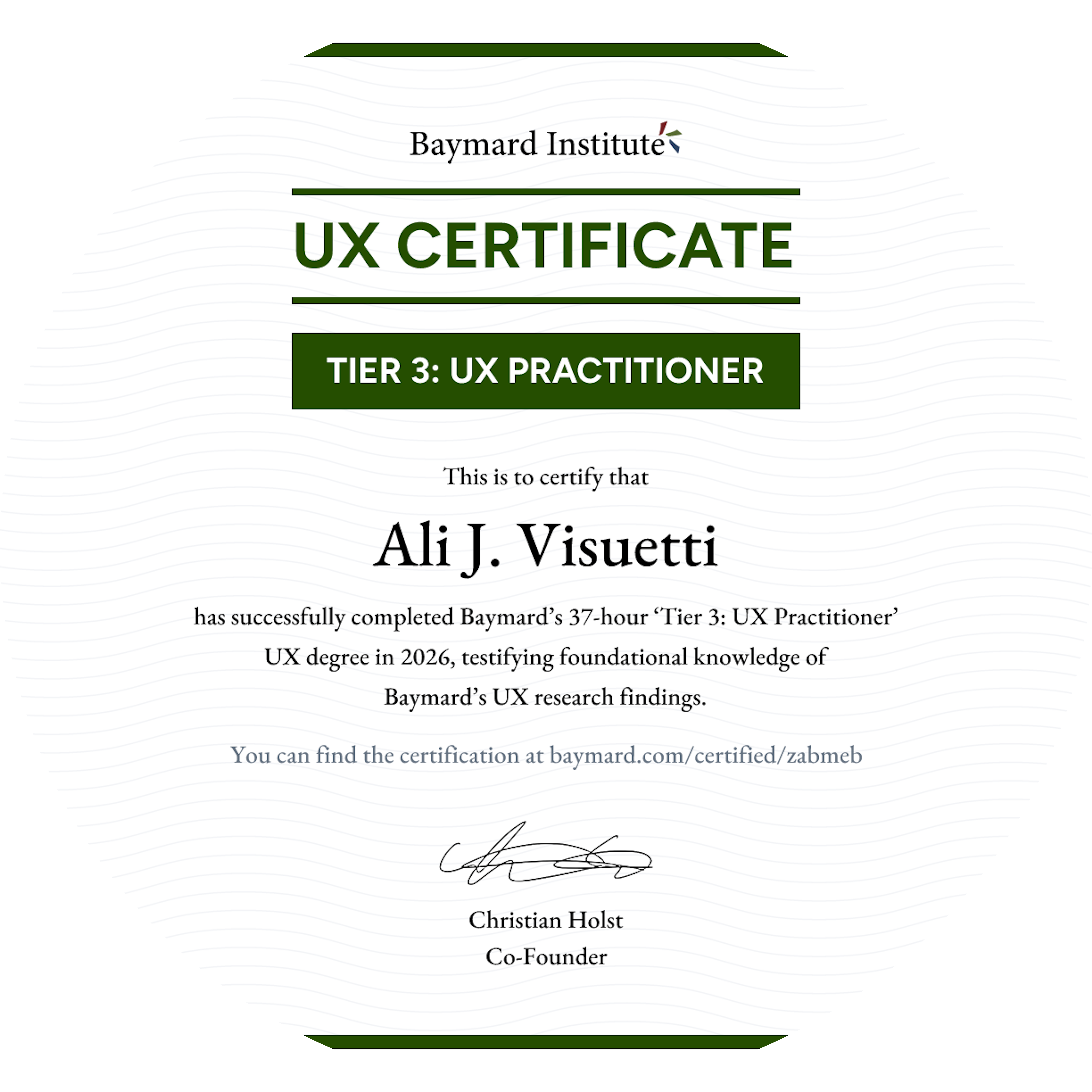 Ali J. Visuetti graduated Baymard’s 37-hour ‘Tier 3: UX Practitioner’ degree in 2026, testifying foundational knowledge of Baymard’s UX research findings.
