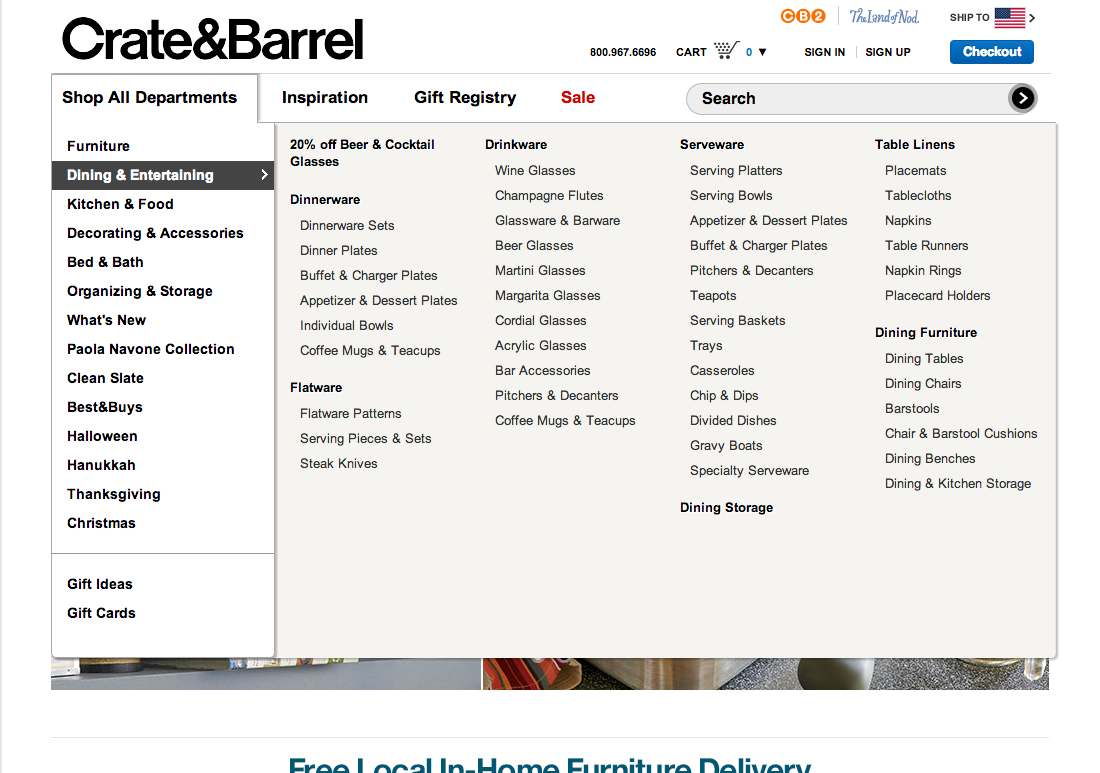 The screenshot was taken on October 17, 2013 and depicts Crate & Barrel’s Main Navigation. In total, we’ve reviewed 81 of Crate & Barrel’s page designs. To see them all, visit the full Crate & Barrel UX case study.