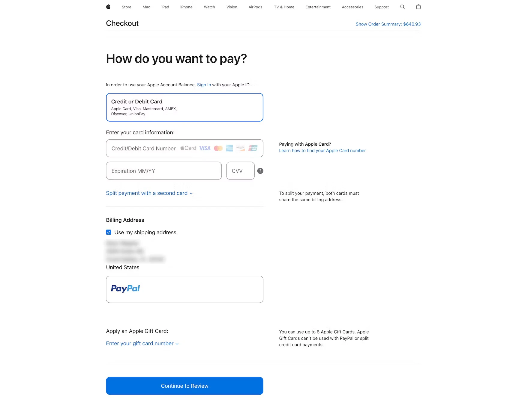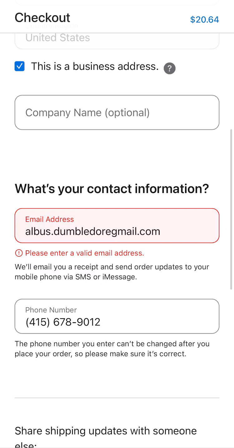 On Apple’s mobile checkout, the site retains all information entered into each field even if the submission triggers an error. This prevents users from needing to reenter previous entries and selections, keeping them focused on the task at hand: resolving the error and continuing to move forward with the process.