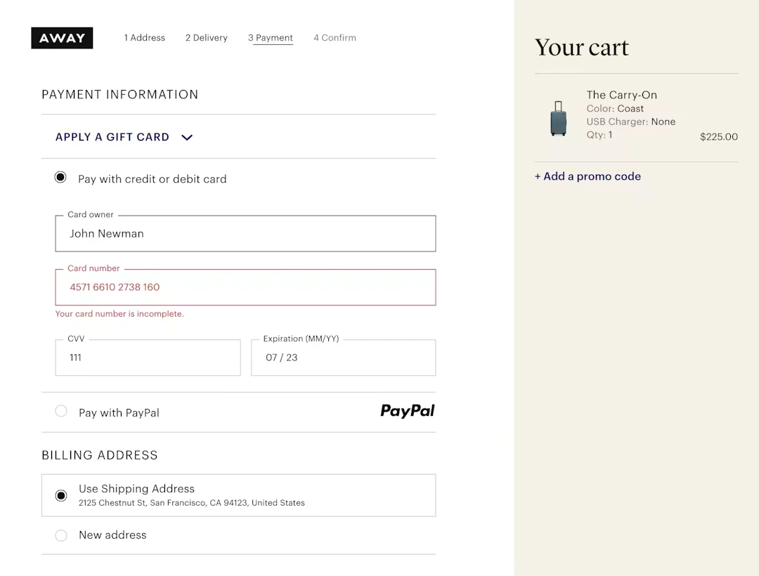 *This error message at Away clearly communicates the precise issue with the card number — “Your card number is incomplete” — rather than a more generic message like “Your card number is invalid”.