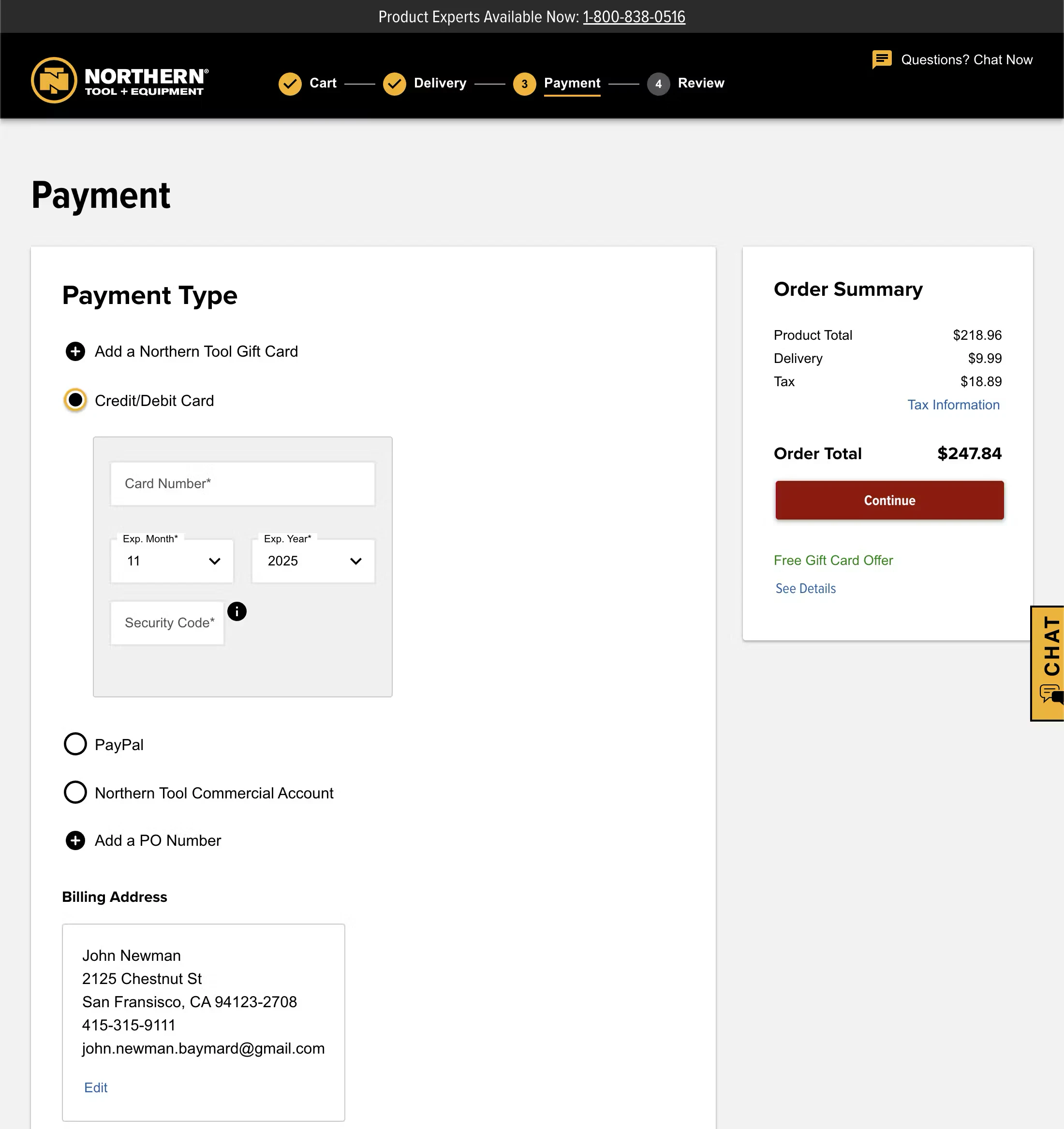 Northern Tool’s checkout flow is linear and clearly defined throughout the entire process. Process steps are provided for a multistep process. Clear and descriptive labels are used for the process steps, with each distinct step visually indicated on-screen.