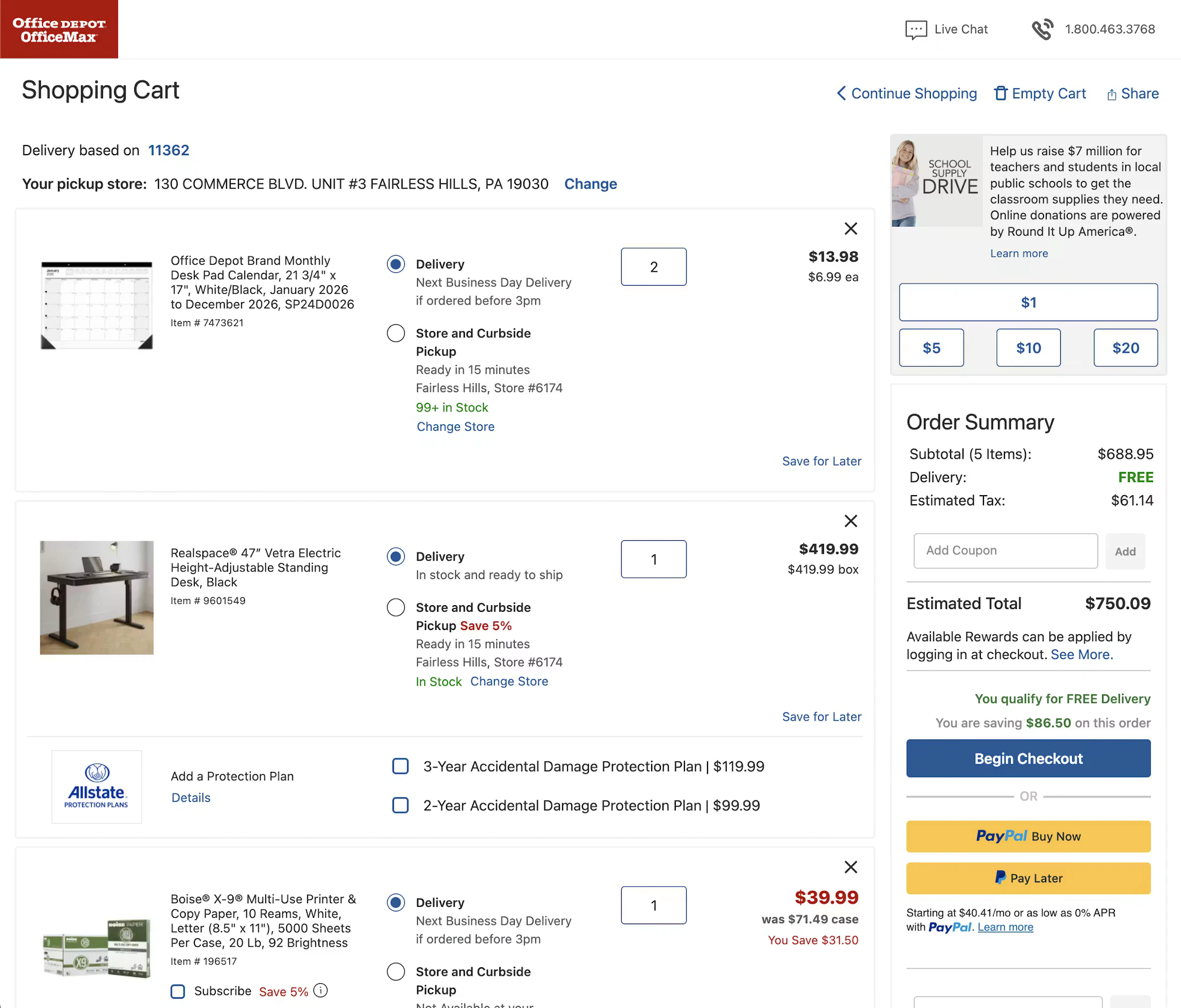 To avoid any nasty surprises and unexpected extra costs, Office Depot provides clear tax estimates, shipping costs, and additional fee information right at the beginning of the flow, in the cart.