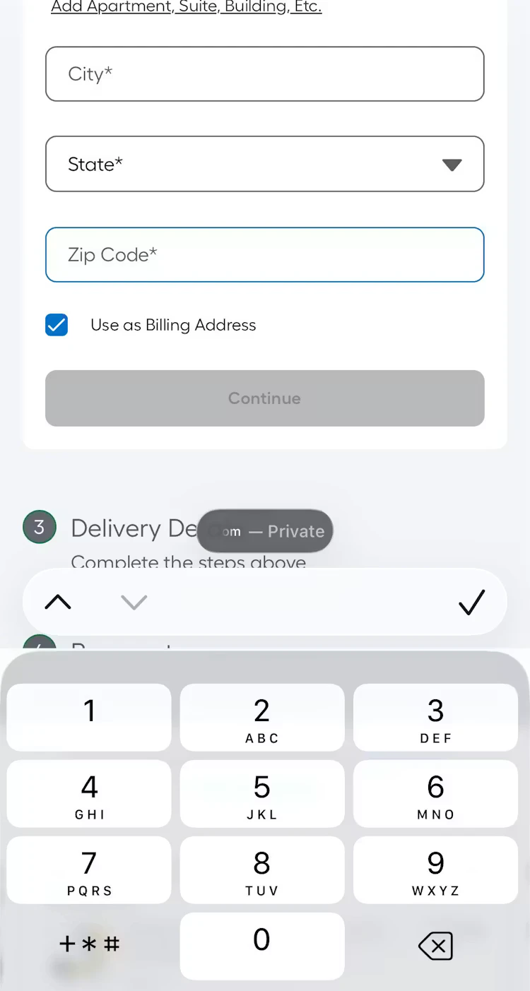On the Lowe’s mobile site, all form fields in the checkout flow invoke the appropriate keyboard layout (letters for text entry e.g. address, and numbers for phone number entry). This saves the user from having to switch from the standard keyboard layout and, in the case of numeric inputs, minimizes typos, as these specialized keyboards have much larger keys that reduce the chance of accidental taps.