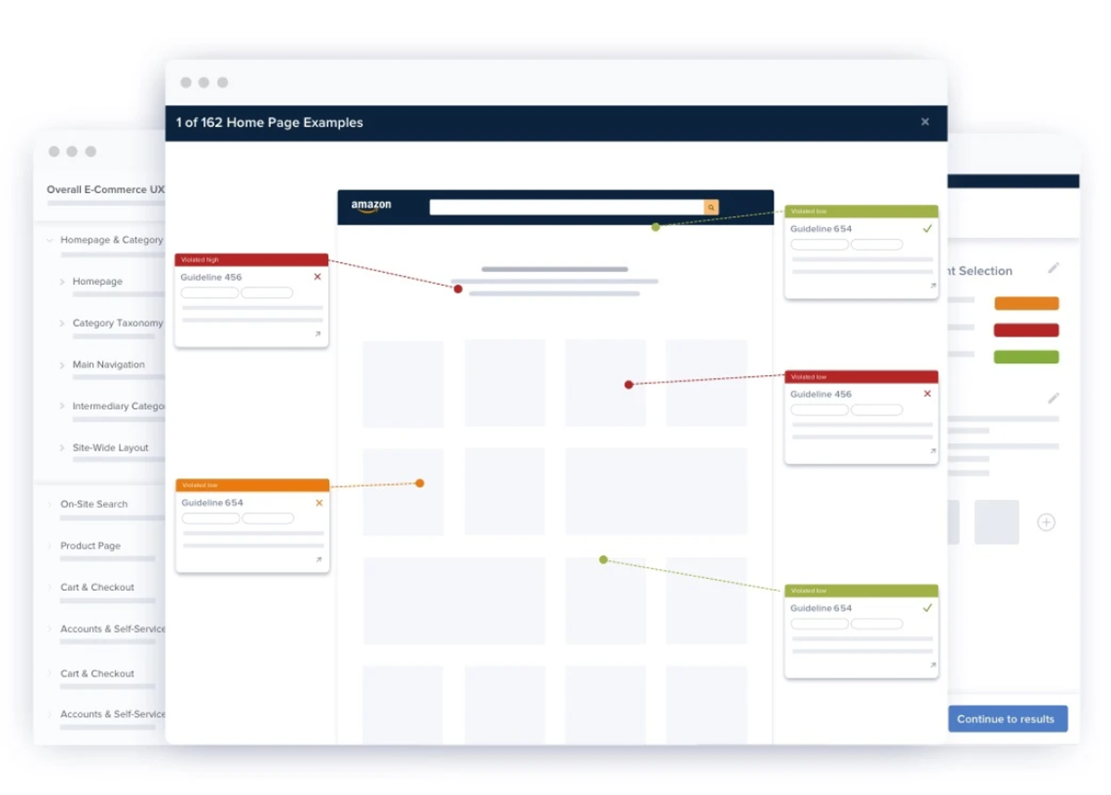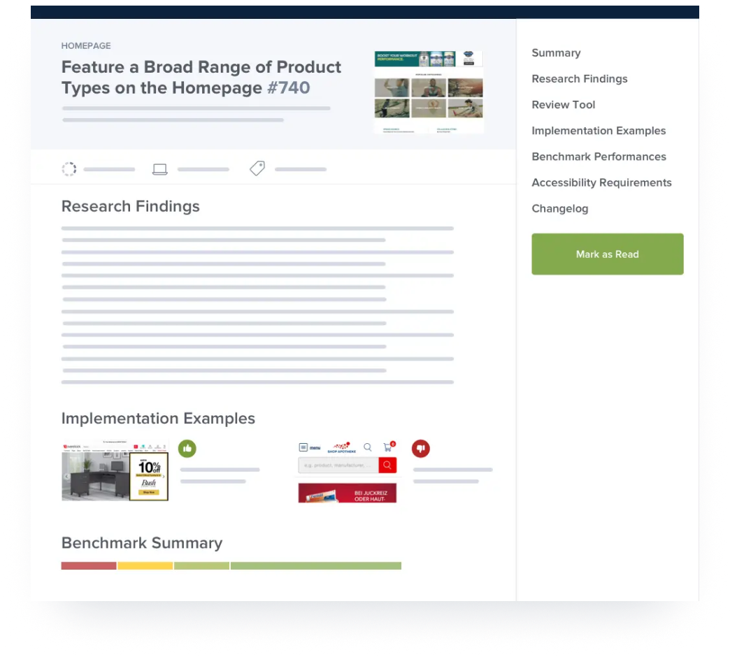 We've benchmarked 250+ top ecommerce sites, analyzing their online shopping experiences against 700+ UX guidelines. This rigorous evaluation provides you instant access to 18,000+ manually reviewed pages, 275,000+ weighted UX performance scores, and 175,000+ best and worst practice examples.