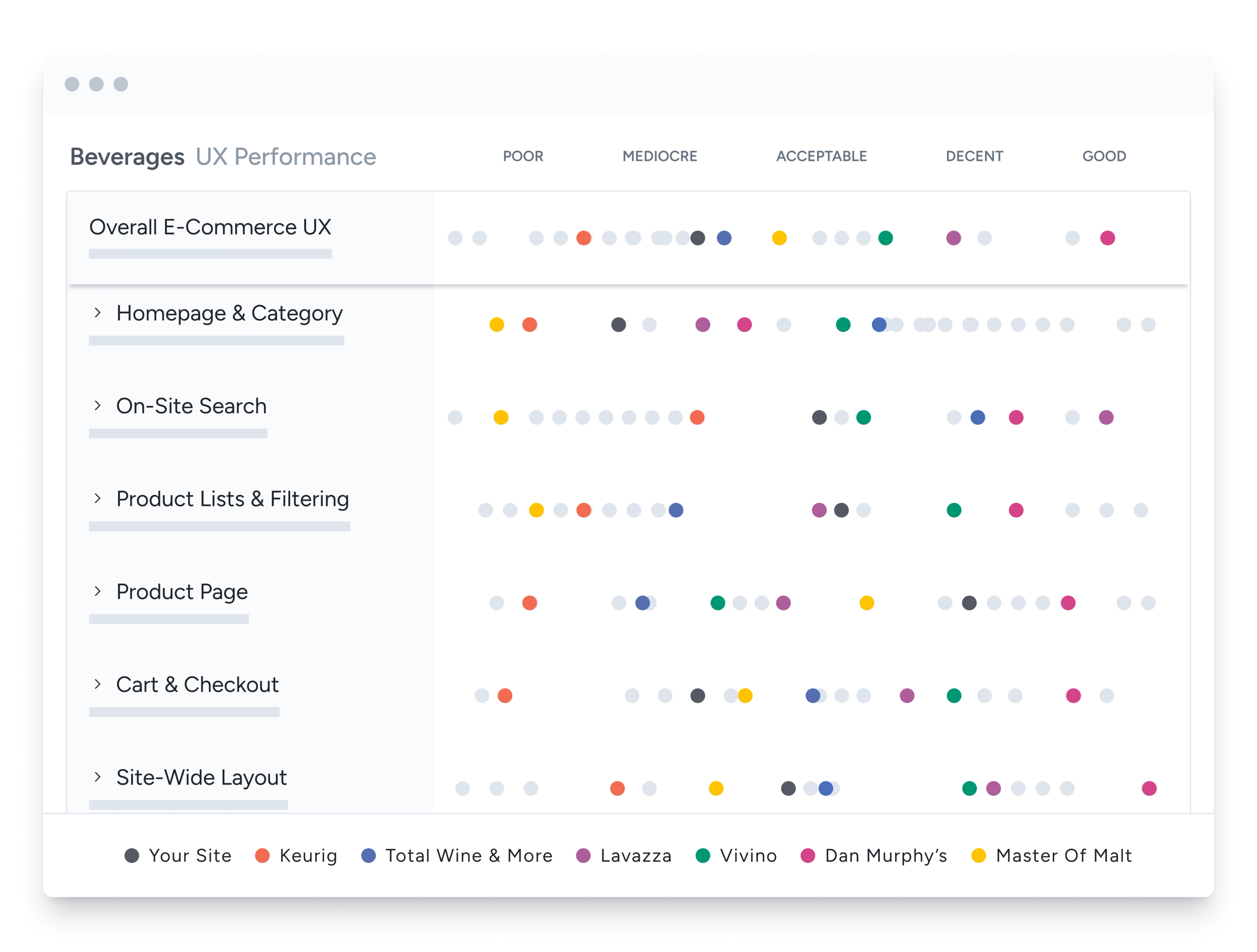 What are the top 40 UX improvements for your "Beverages" site? How does your UX performance compare to Keurig, Lavazza, Total Wine & More, Vivino, Dan Murphy’s, Master Of Malt, and The Whisky Exchange?