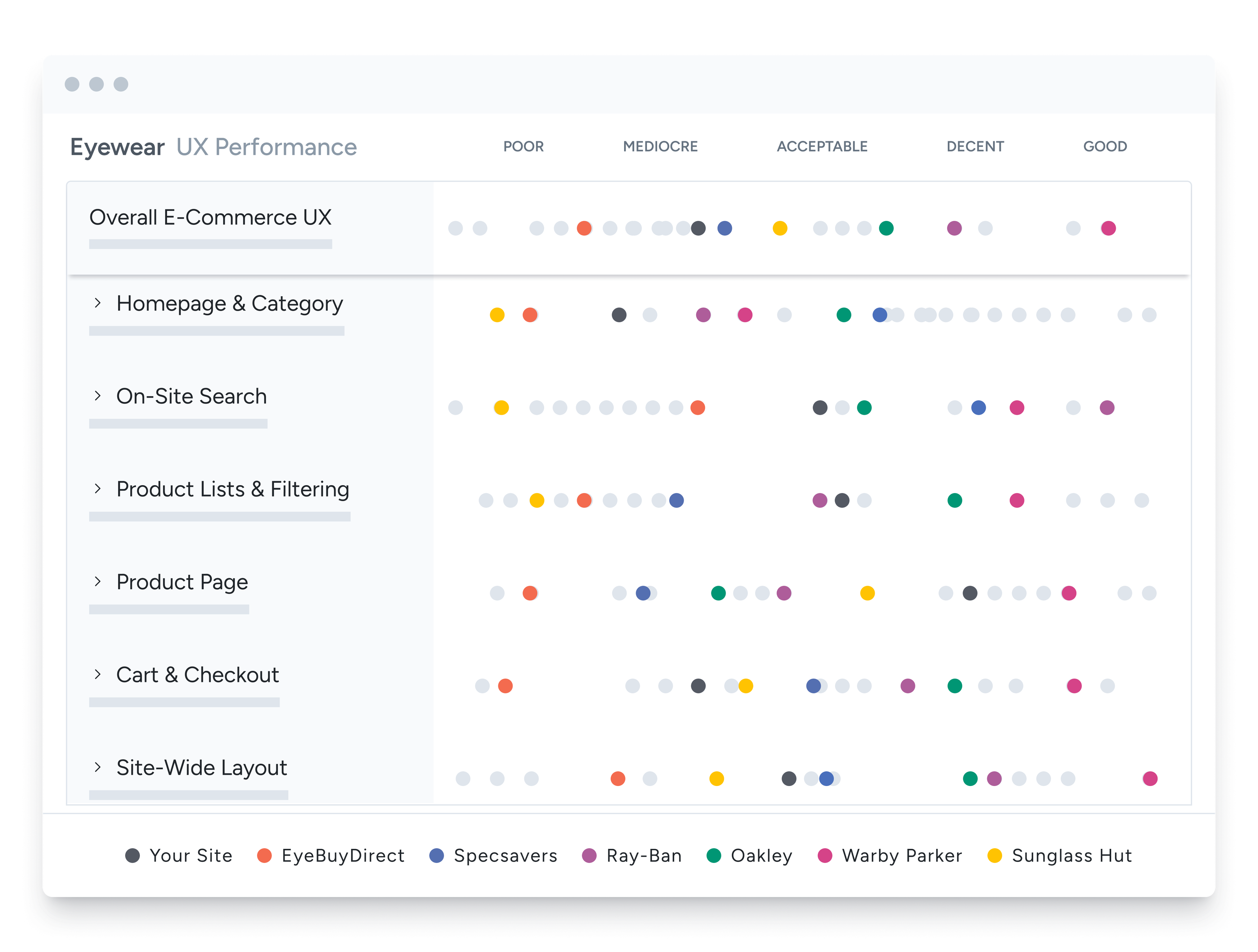 What are the top 40 UX improvements for your Eyewear site? How does your UX performance compare to Specsavers, Ray-Ban, Oakley, Warby Parker, Sunglass Hut, and EyeBuyDirect?