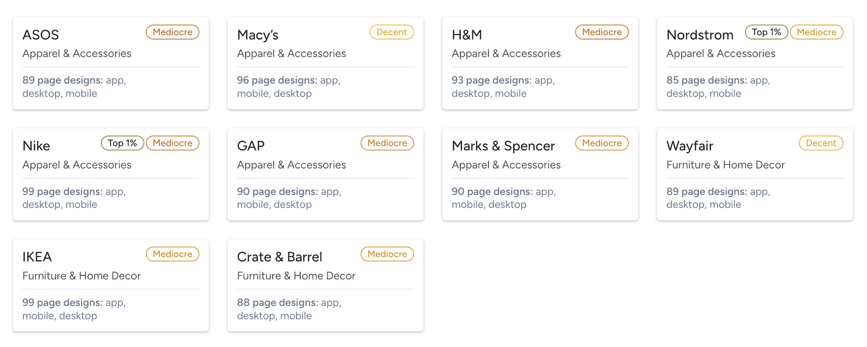 These case studies are now available in the Apparel & Accessories and Furniture & Home Decor benchmark collections, and in our Ecommerce UX Benchmark collection.